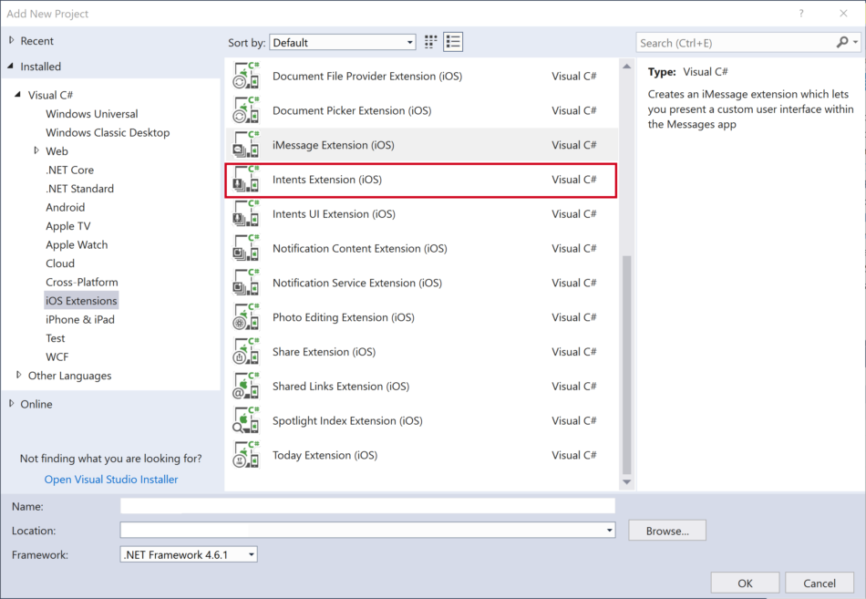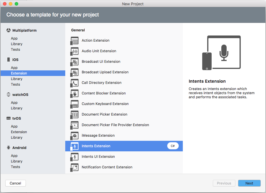 - Adicione um projeto de Extensão de Interface do Usuário de Intenções à solução de aplicativo Xamarin.iOS.