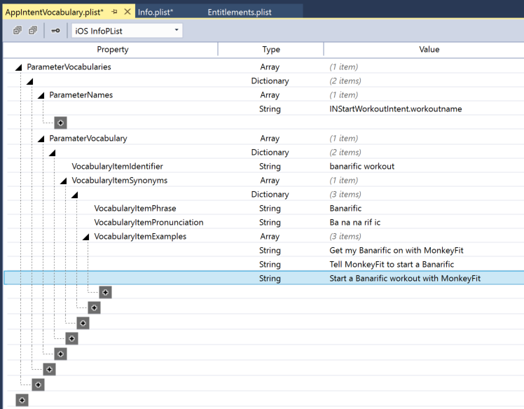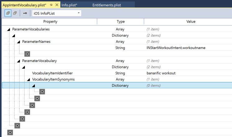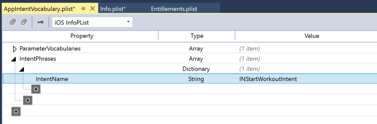 Para configurar o arquivo da Extensão de Interface do Usuário de Info.plist Intenção, clique duas vezes nele no Gerenciador de Soluções para abri-lo para edição. Em seguida, alterne para a visualização Fonte e expanda as NSExtension teclas e NSExtensionAttributes no editor: