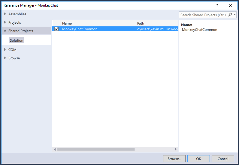 MonkeyChatCommonpara o Nome e clique no botão Criar :Clique com o botão direito do mouse na pasta Referências do aplicativo principal no Gerenciador de Soluções e selecione Editar Referências.... Verifique o projeto MonkeyChatCommon e clique no botão OK:
