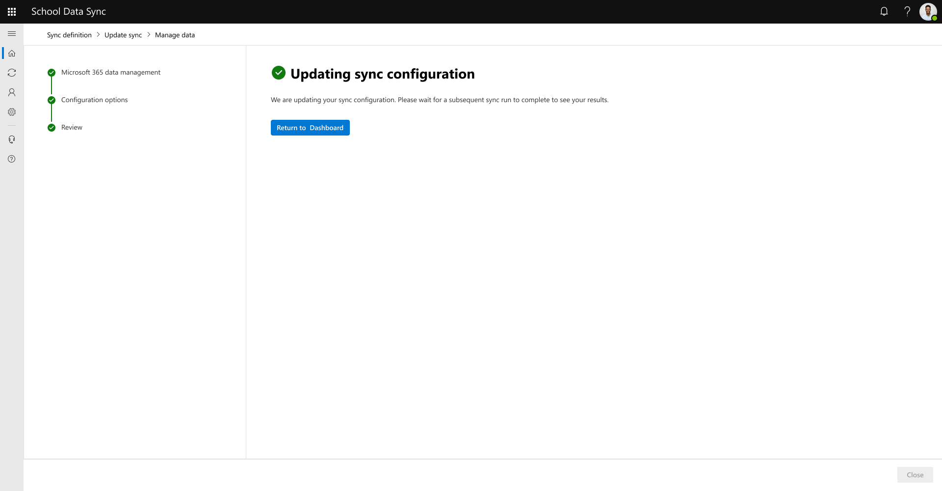 O pedido de atualização da configuração de sincronização foi enviado. Aguarde pela conclusão de uma execução de sincronização subsequente para ver os resultados. Selecione Regressar ao Dashboard.