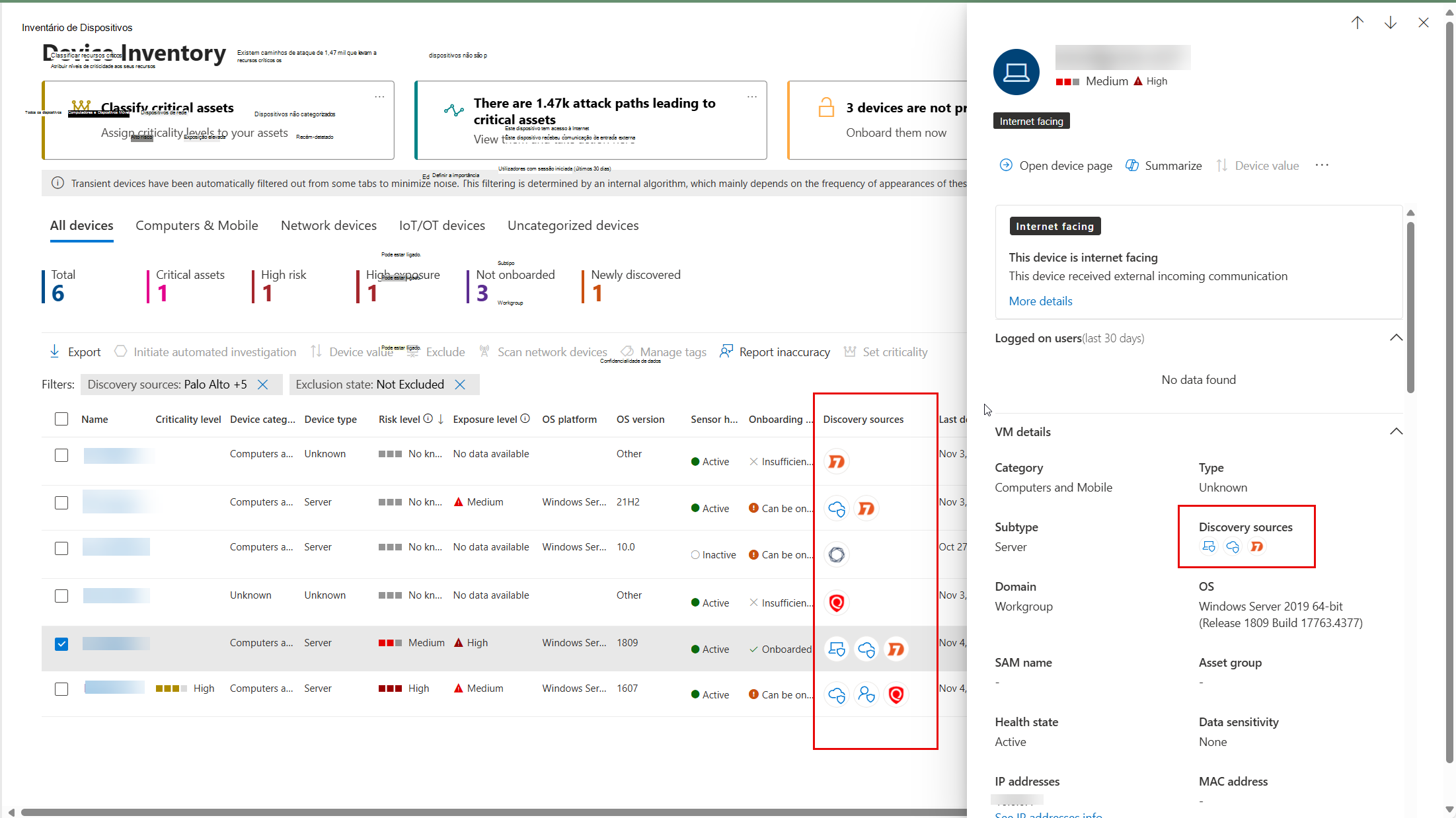 No Inventário de Dispositivos, verá as origens de deteção de cada dispositivo, que são os produtos a partir dos quais recebemos qualquer relatório sobre este dispositivo. Estes podem incluir produtos de Segurança da Microsoft, como MDPE, MDC e MDI, bem como origens de dados externas, como Qualys ou ServiceNow CMDB. Pode filtrar uma ou mais origens de deteção no inventário para ver os dispositivos que foram detetados especificamente por essas origens.