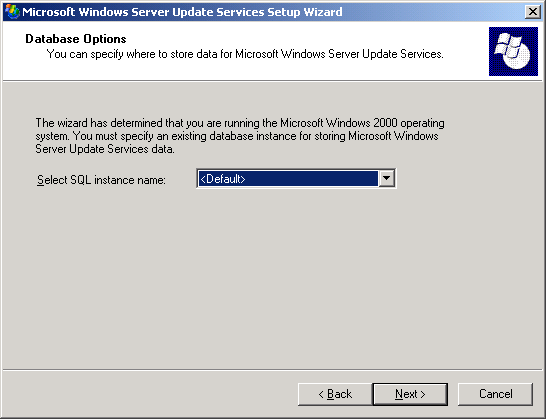 After reviewing the installation requirements and optionally installing MSDE, you are ready to install WSUS. The following procedure uses the default WSUS installation options for Windows 2000 Server with SUS installed. This requires you to supply database software, store updates locally, and use the custom Web site on port 8530. If you are using Windows Server 2003, you do not have to supply database software. Although some illustrations may look slightly different from screens in Windows Server 2003, the steps are very similar. Any procedural differences are called out in the text of this guide.