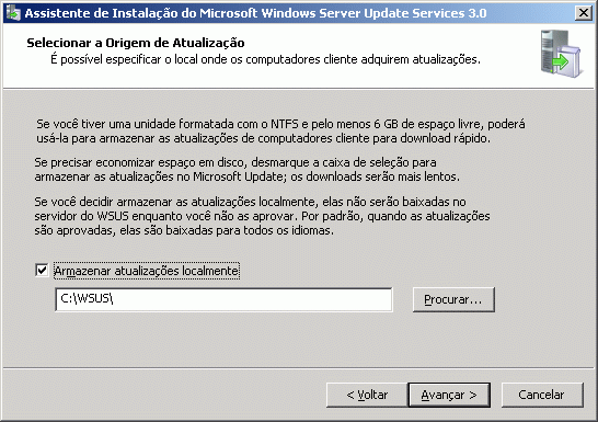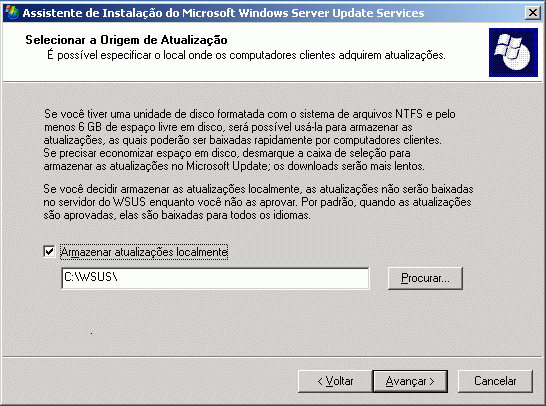 On the Select Update Source page, you can specify where clients get updates. If you select the Store updates locally check box, updates are stored on the WSUS server and you select a location in the file system to store updates. If you do not store updates locally, client computers connect to Microsoft Update to get approved updates.