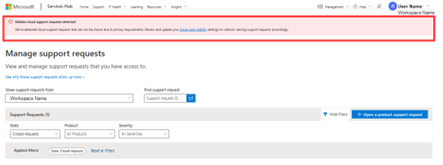 As solicitações de suporte criadas em um dos portais de nuvem da Microsoft não são visíveis automaticamente em um espaço de trabalho do Services Hub. Um usuário cliente com permissões apropriadas deve “consentir” para que as solicitações de suporte à nuvem fiquem visíveis (ou não) no Services Hub.