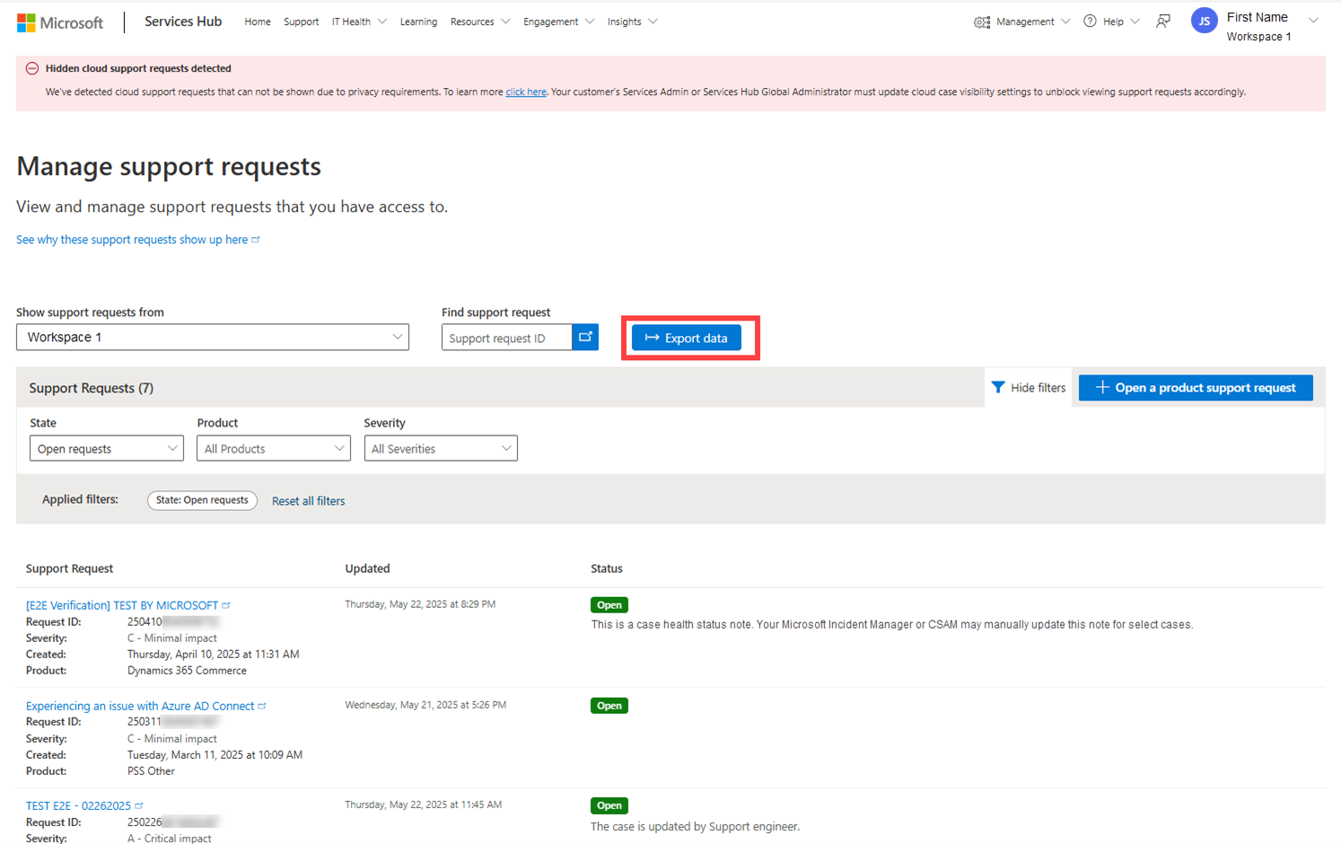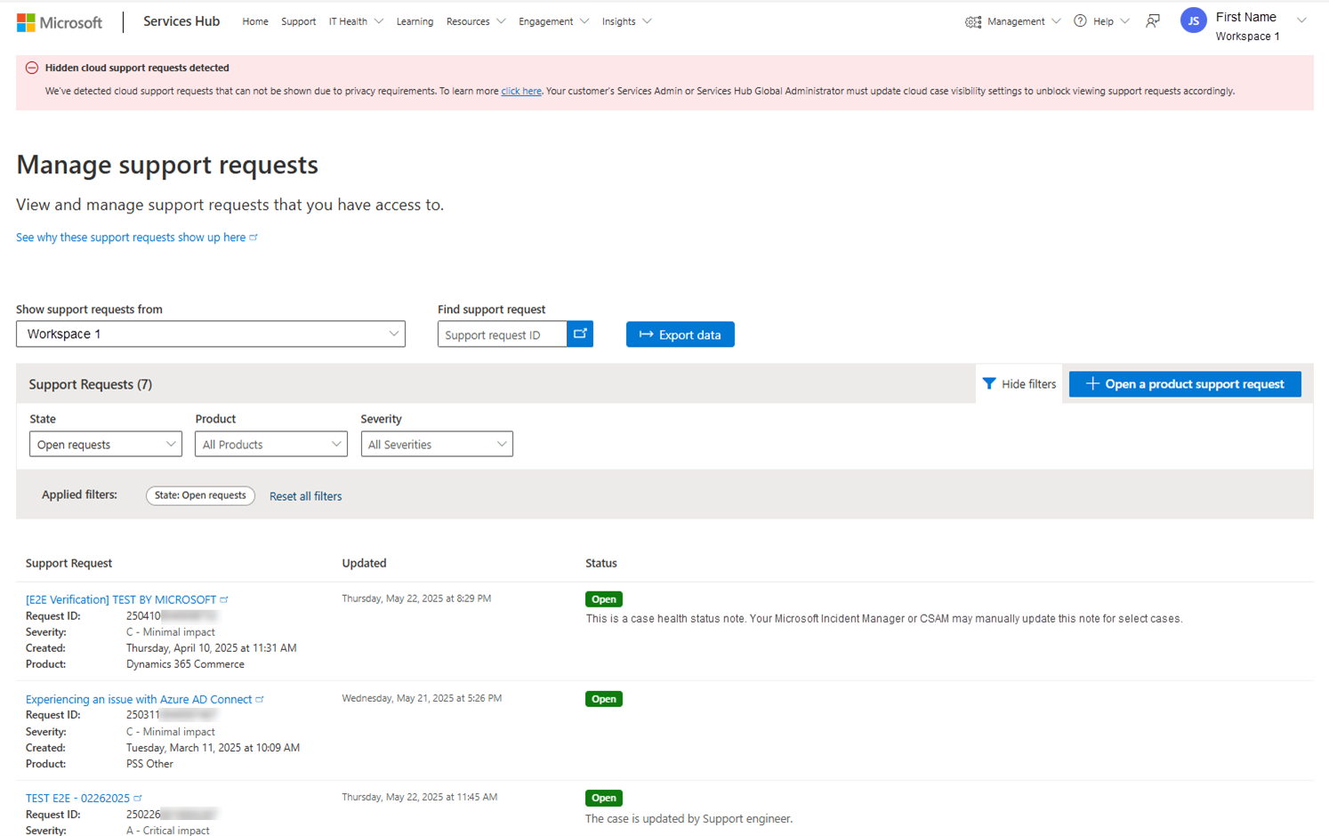 Os usuários do espaço de trabalho que têm a permissão "Suporte" poderão visualizar uma lista de suas próprias solicitações de suporte no espaço de trabalho ativo. Isso requer que a identidade com a qual eles estão conectados ao Services Hub corresponda à identidade com a qual eles usaram para abrir a solicitação de suporte.