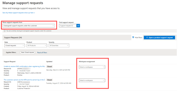 É necessária uma ação quando solicitações de suporte não são atribuídas automaticamente a um espaço de trabalho do Services Hub. Um usuário deve tomar medidas para atribuir essas solicitações de suporte.