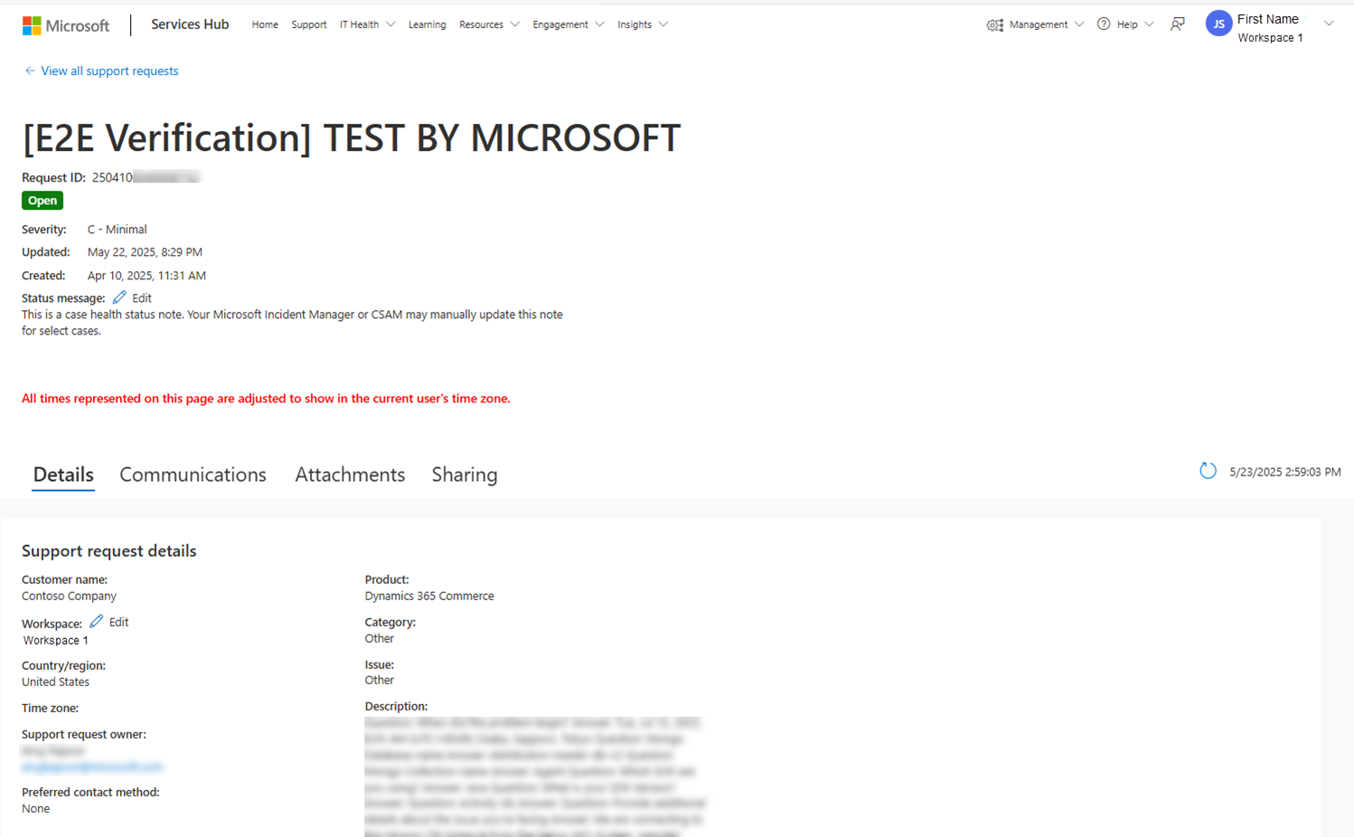 Usuários com acesso a esta página também podem visualizar mais detalhes sobre uma solicitação de suporte individual ao selecionar o link do ID da solicitação de suporte. A captura de tela a seguir mostra um exemplo da página de detalhes. Os usuários exibem comunicações sobre a solicitação de suporte, bem como exibem ou adicionam anexos. A nota de status de integridade do caso também pode ser visualizada aqui.