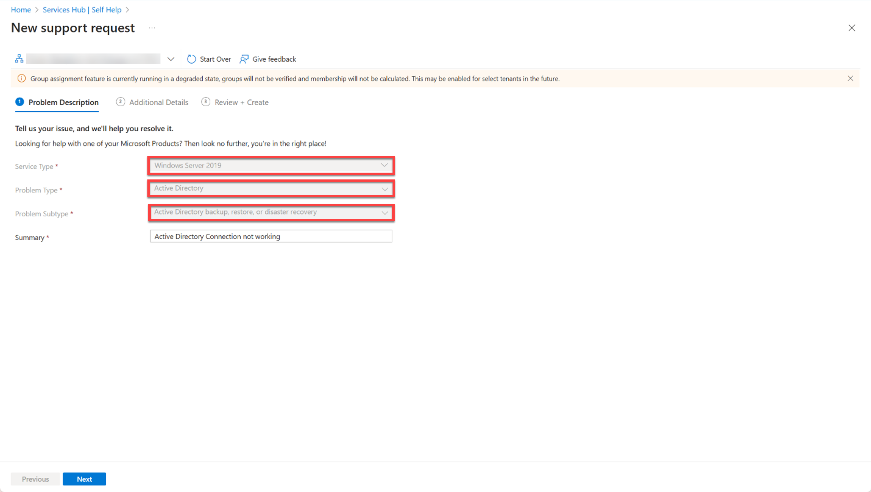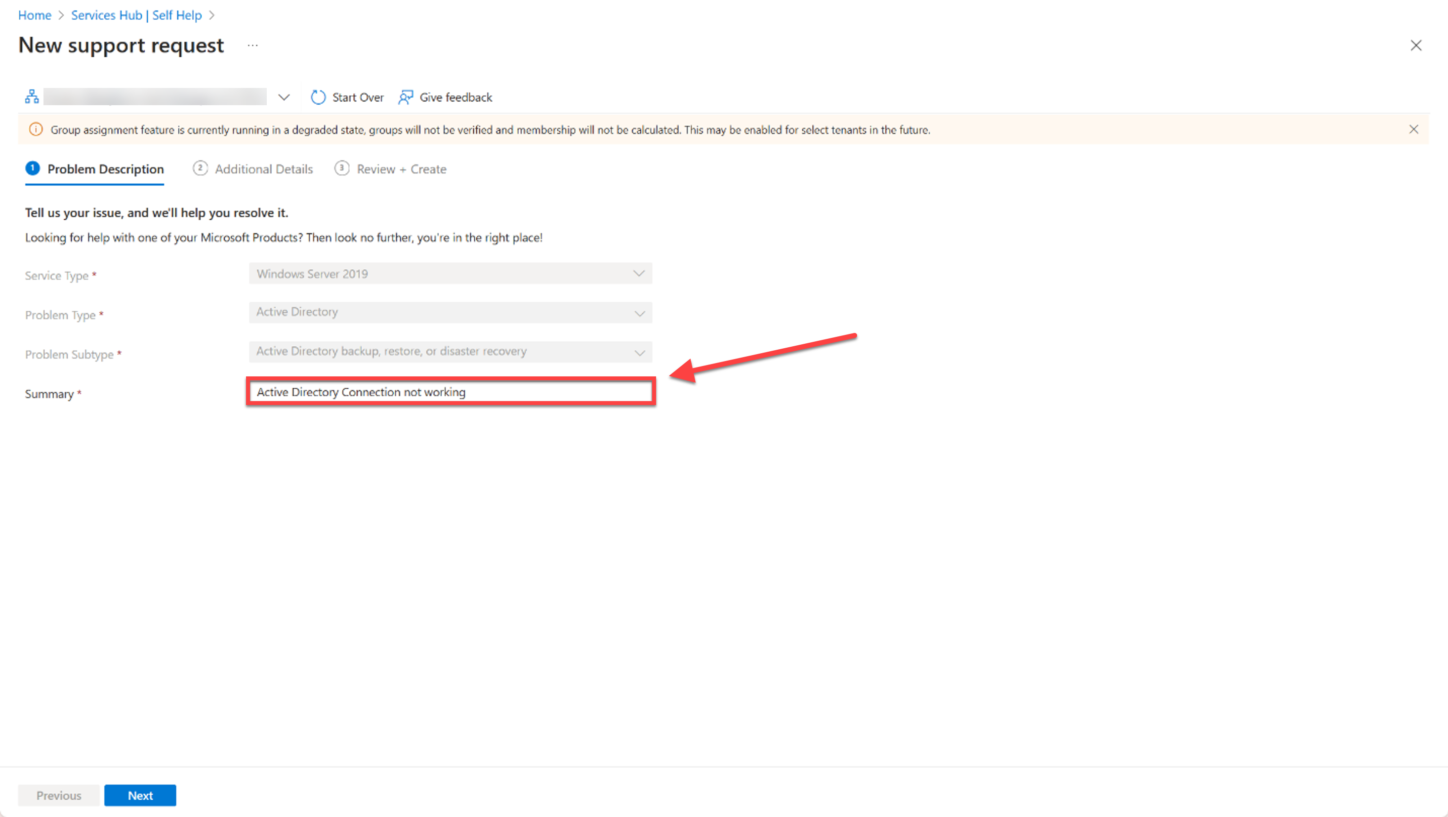 Na seção Descrição do problema, selecione o tipo de serviço, o tipo de problema e o subtipo problema nas listas suspensas. Em seguida, forneça um resumo do problema atual.