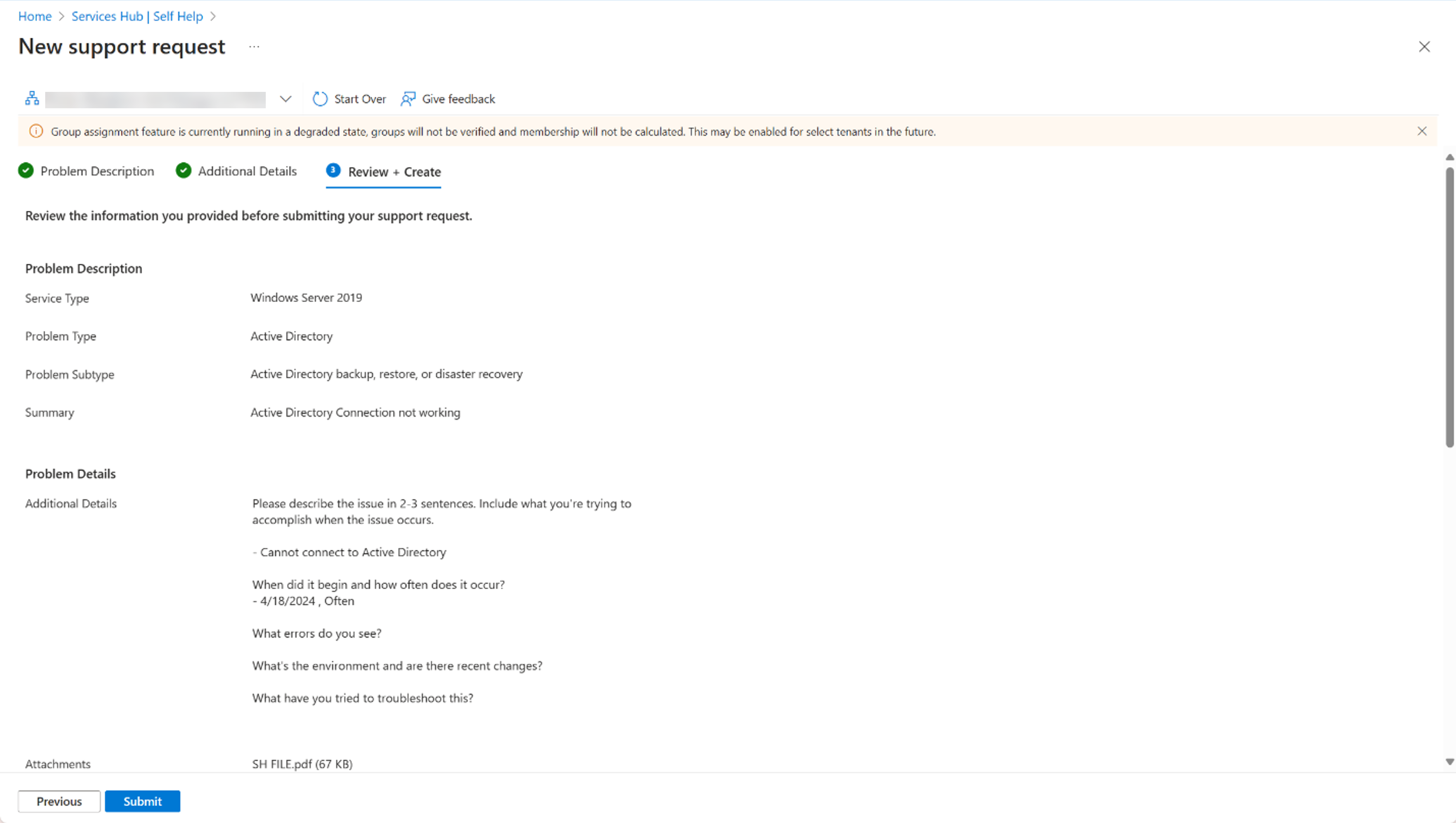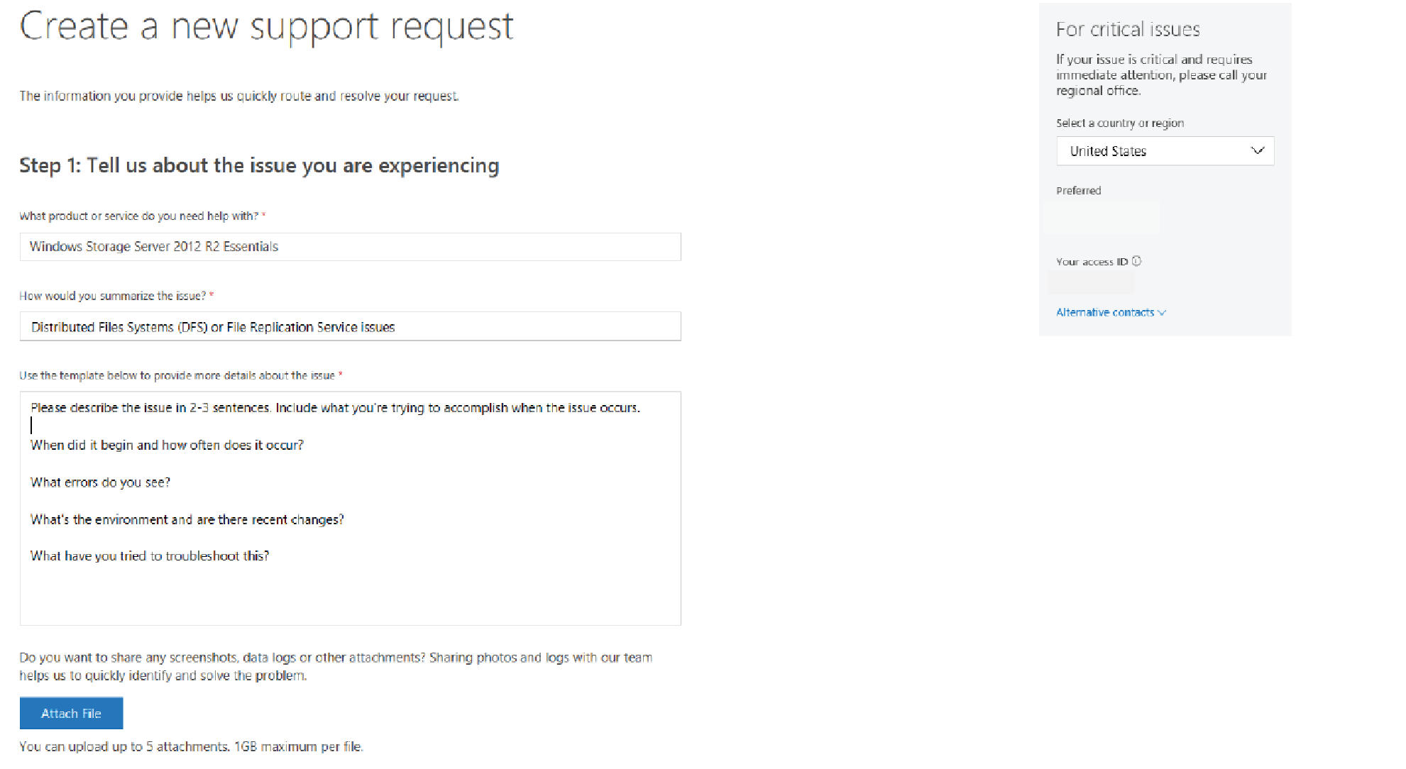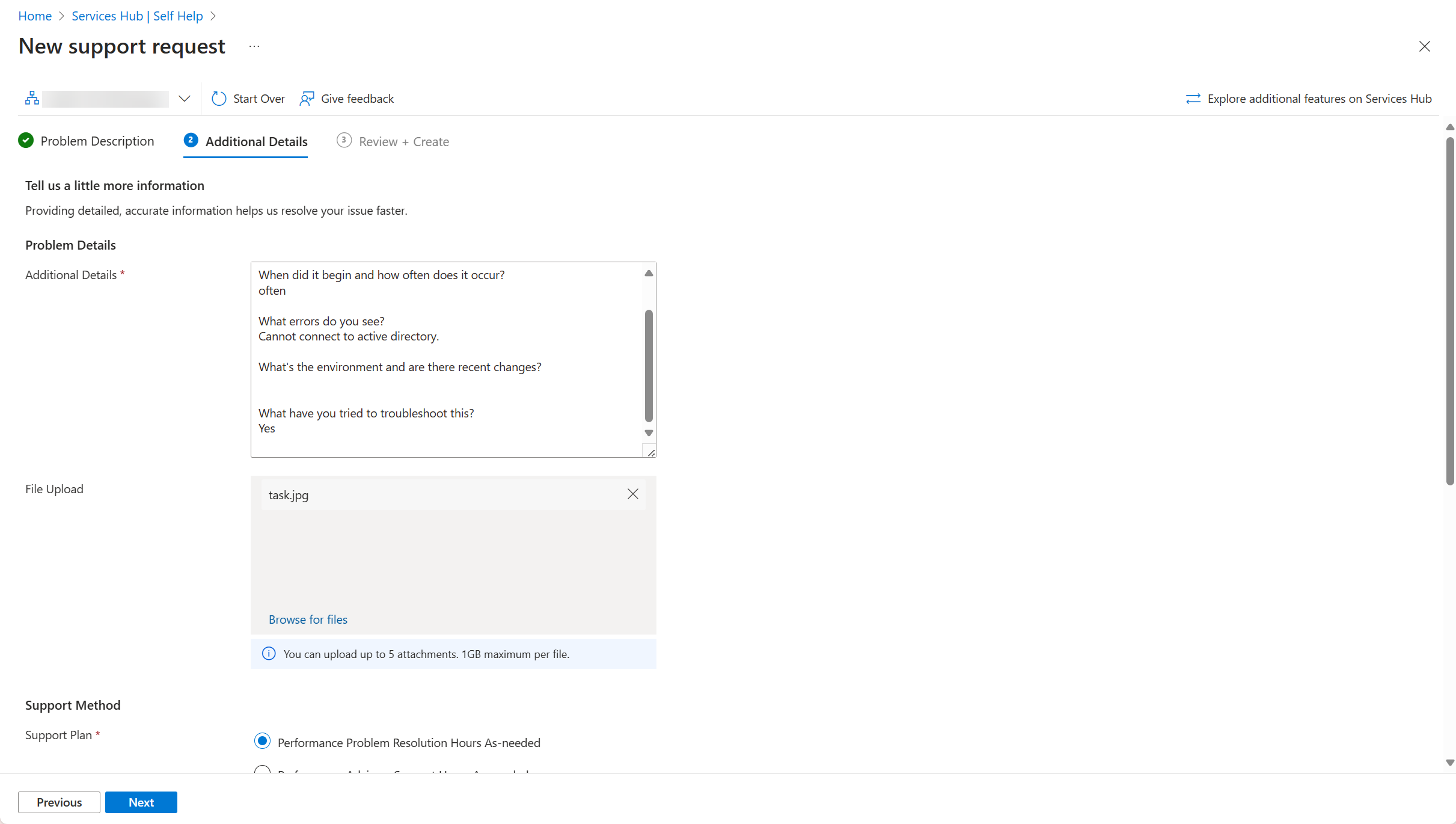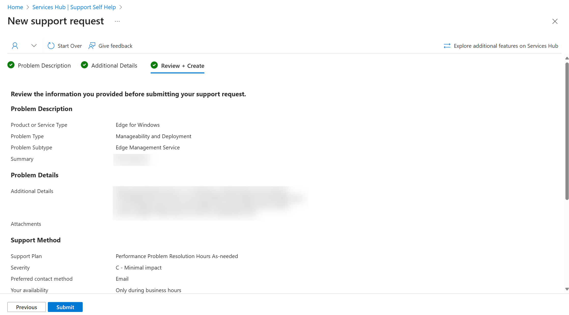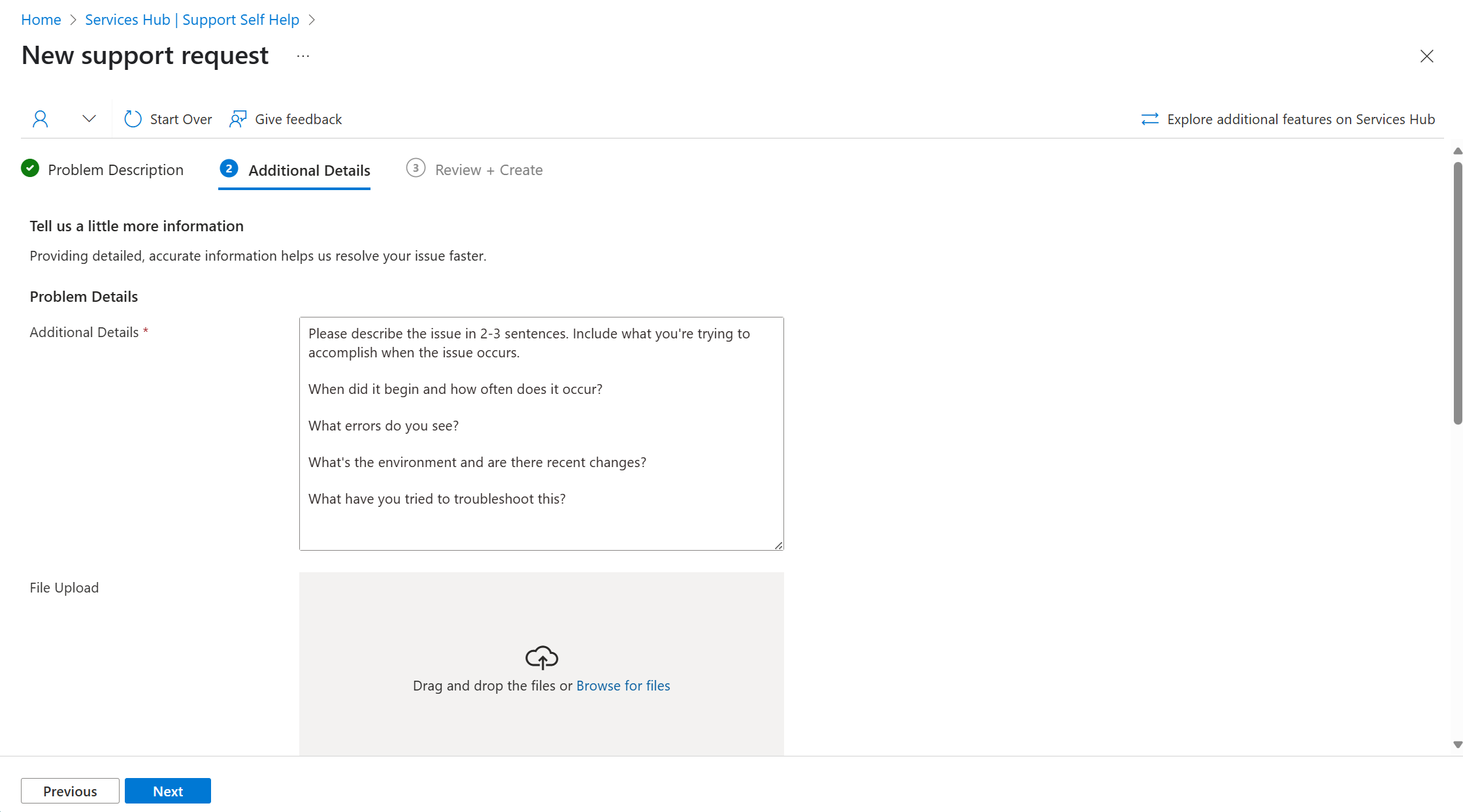 Na seção Detalhes adicionais, preencha todas as caixas necessárias para fornecer detalhes adicionais relacionados à solicitação de suporte a problemas.