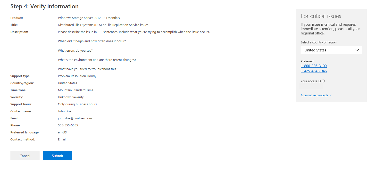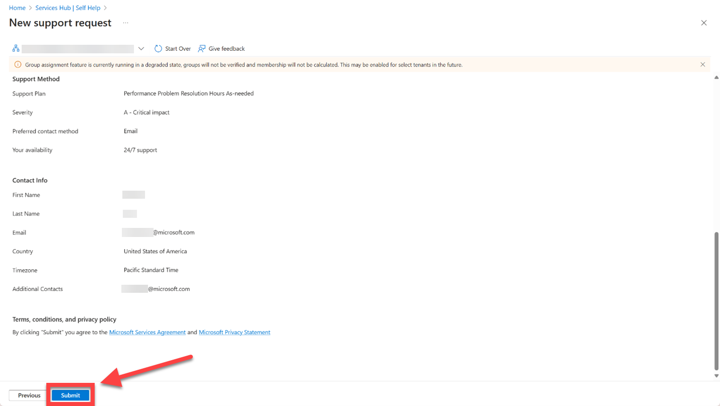 Por fim, verifique os detalhes da nova solicitação de Suporte da Microsoft e selecione Enviar para salvar sua nova solicitação de suporte.