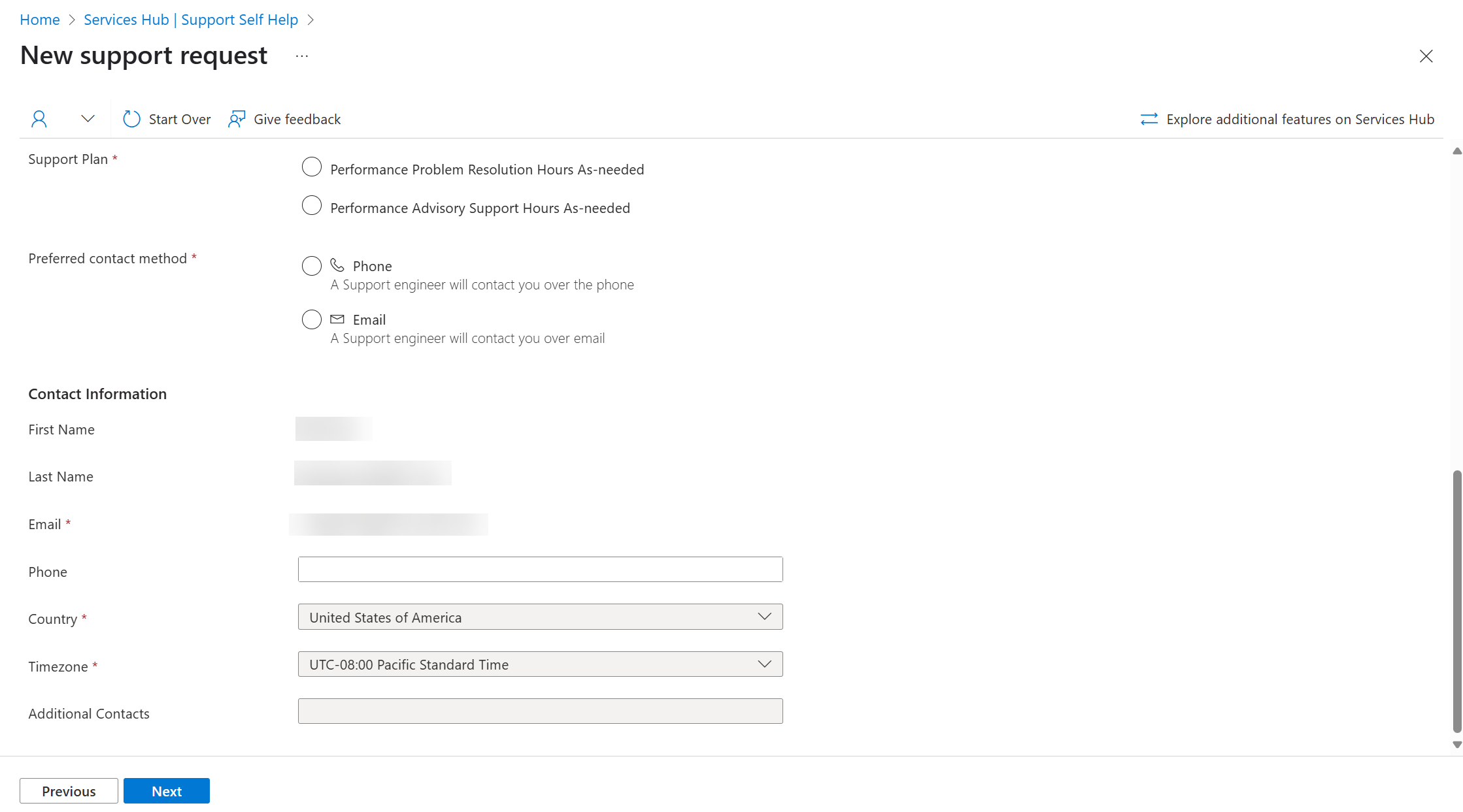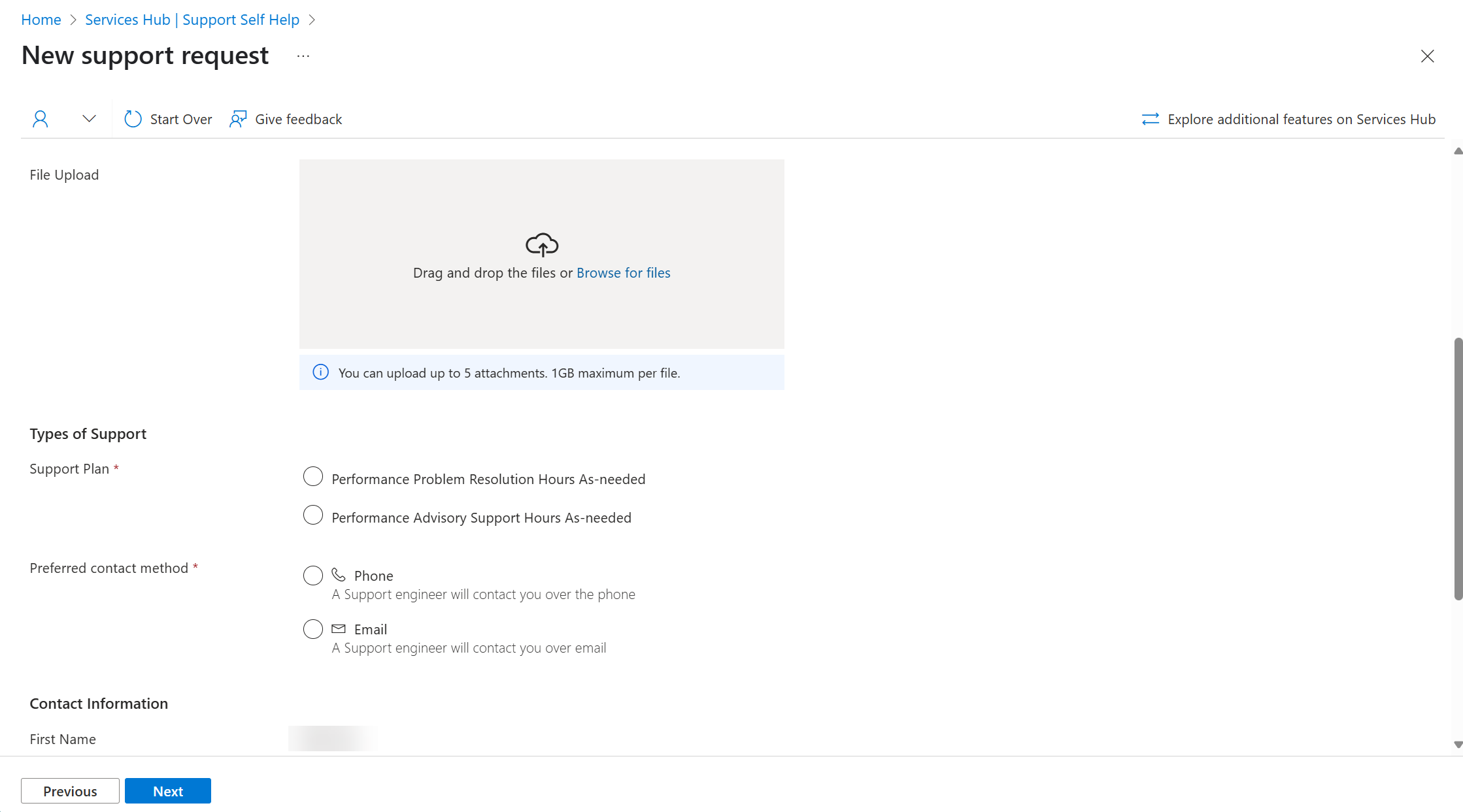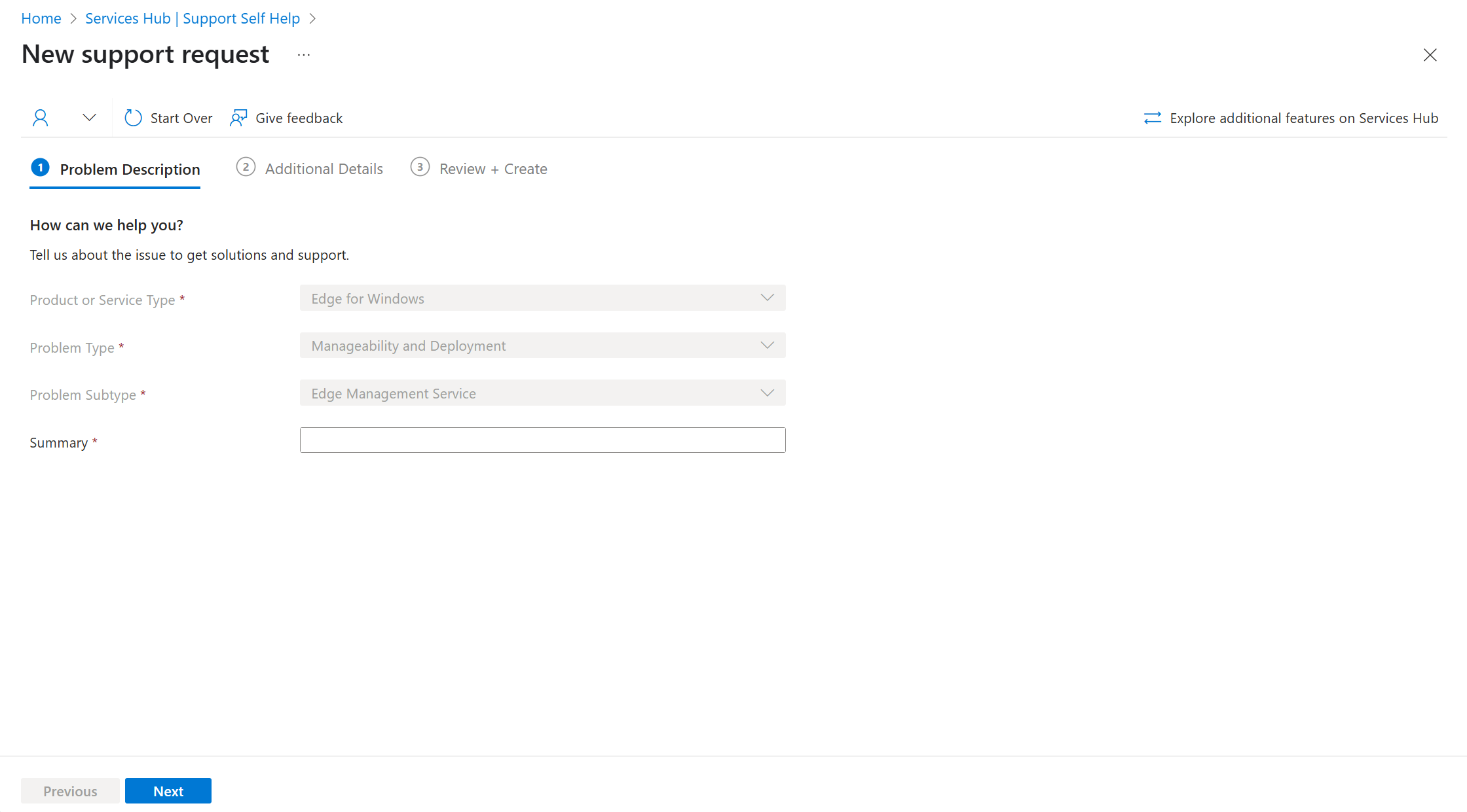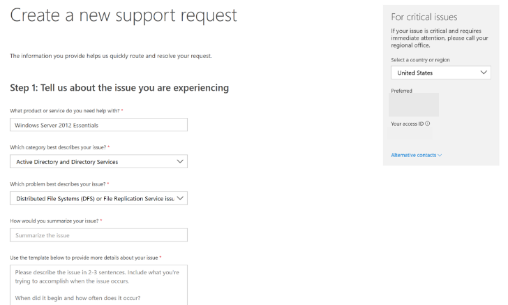 Se você vir este formulário de solicitação de suporte depois de selecionar Usar a nova experiência de suporte no Services Hub, selecione Experiência avançada nas guias na parte superior deste artigo e siga as instruções fornecidas.