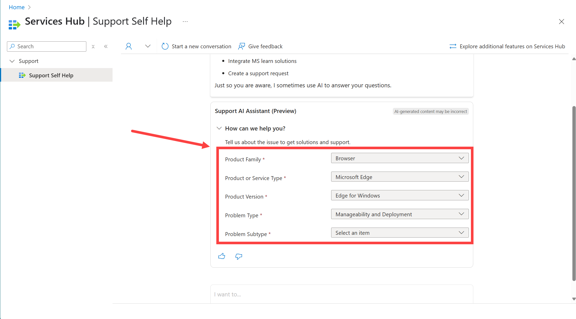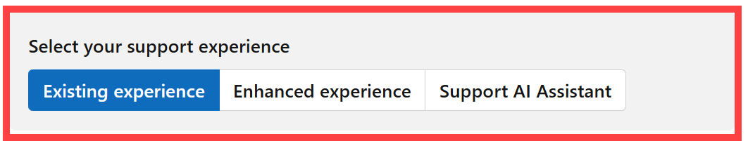 Isso levará você ao novo processo de solicitação de suporte do Assistente de IA de suporte. A seção a seguir fornece instruções para você seguir quando chegar lá.
