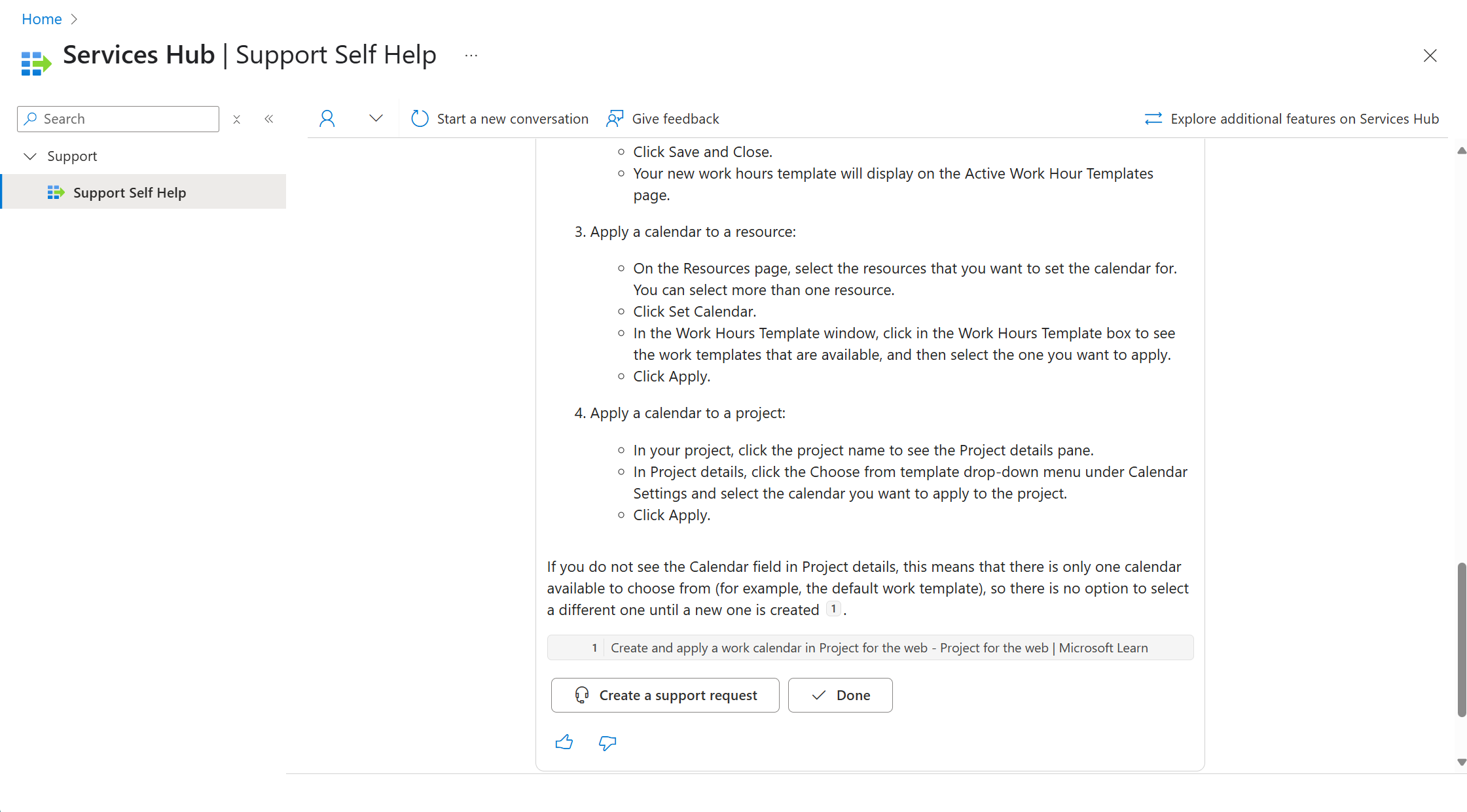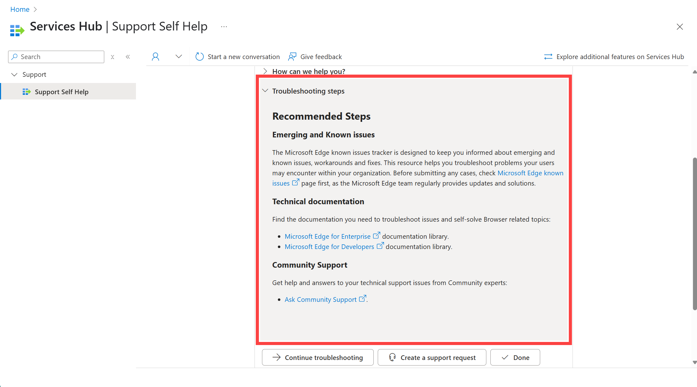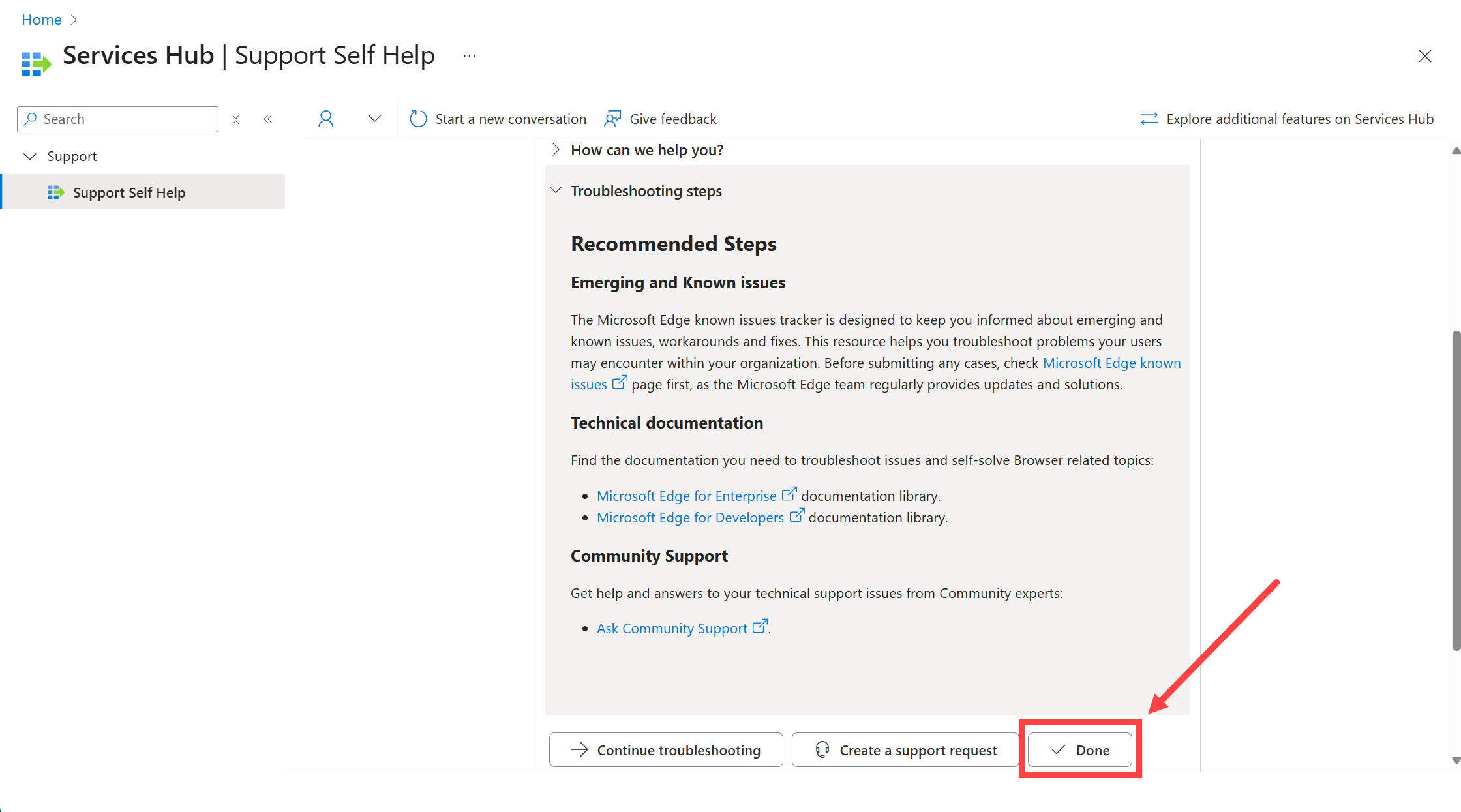 Selecione "Concluído" se as informações mais recentes resolverem seu problema. Selecione "Criar uma solicitação de suporte" se ainda quiser mais assistência (vá para a etapa cinco para obter instruções).