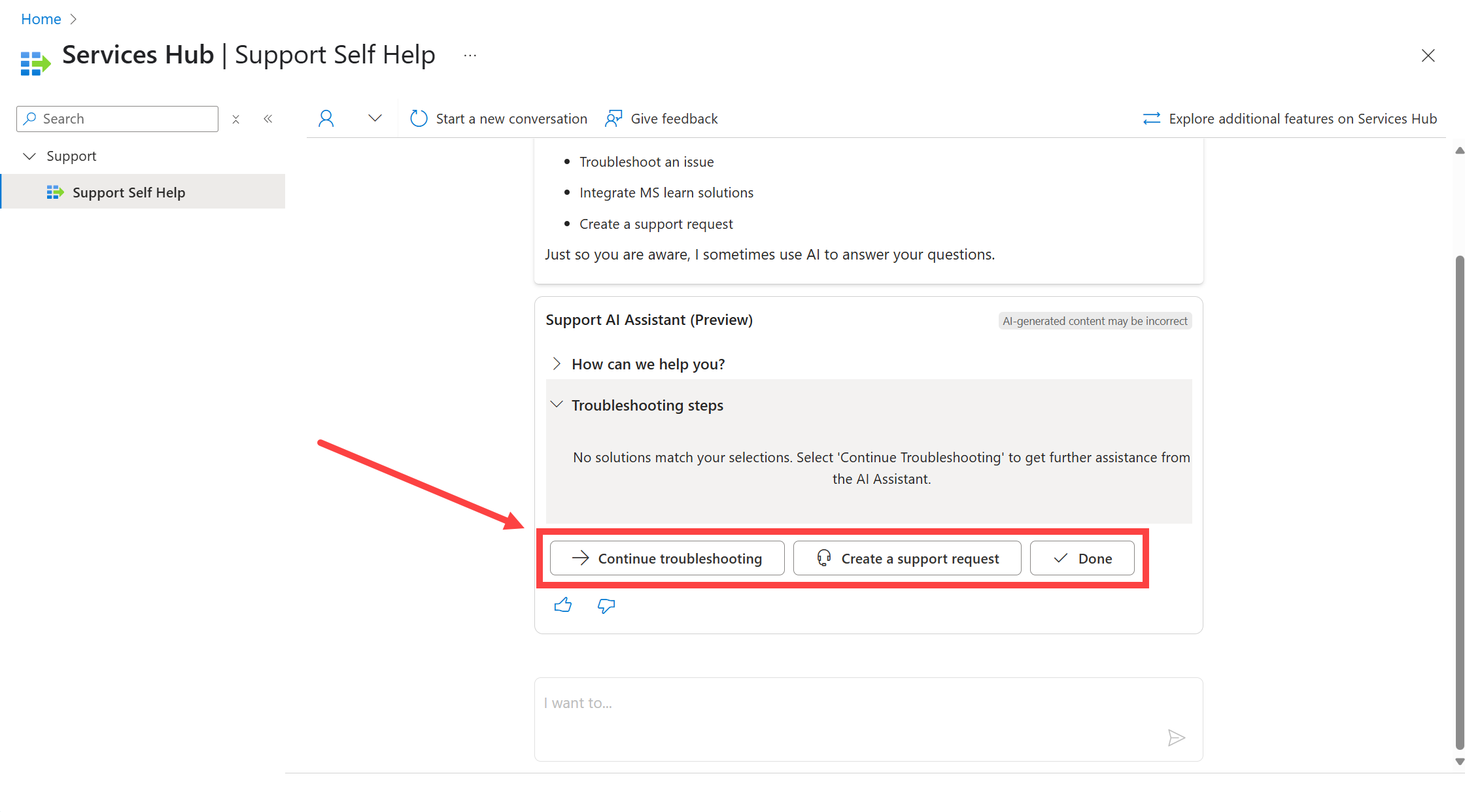 Se você selecionar "Continuar a solução de problemas", o assistente de IA de suporte solicitará que você forneça mais informações por meio de uma caixa de texto.