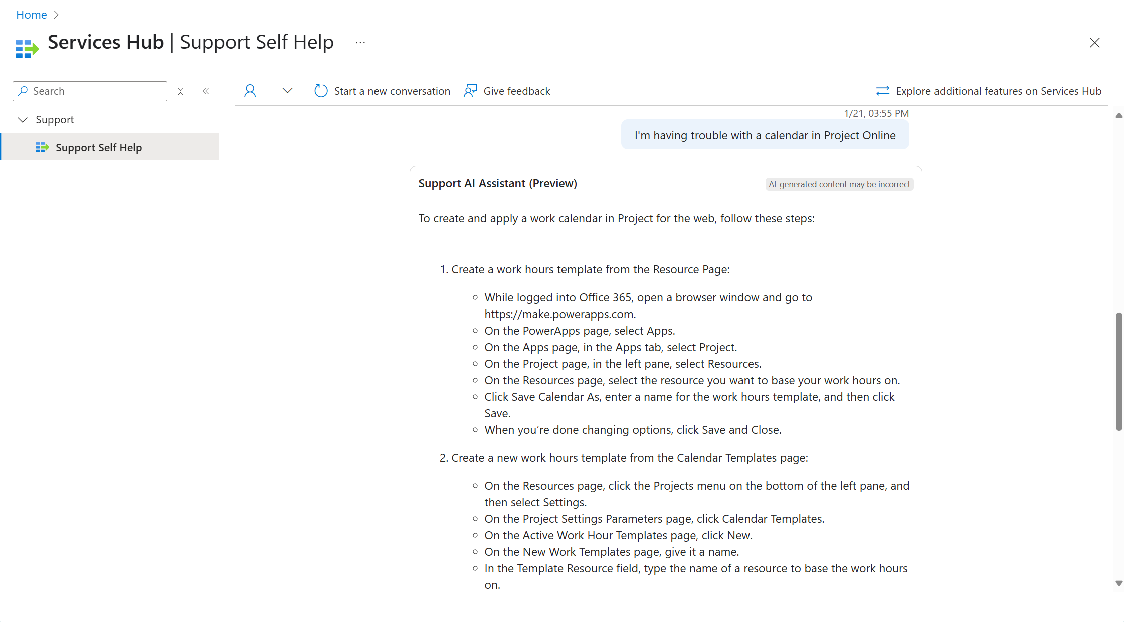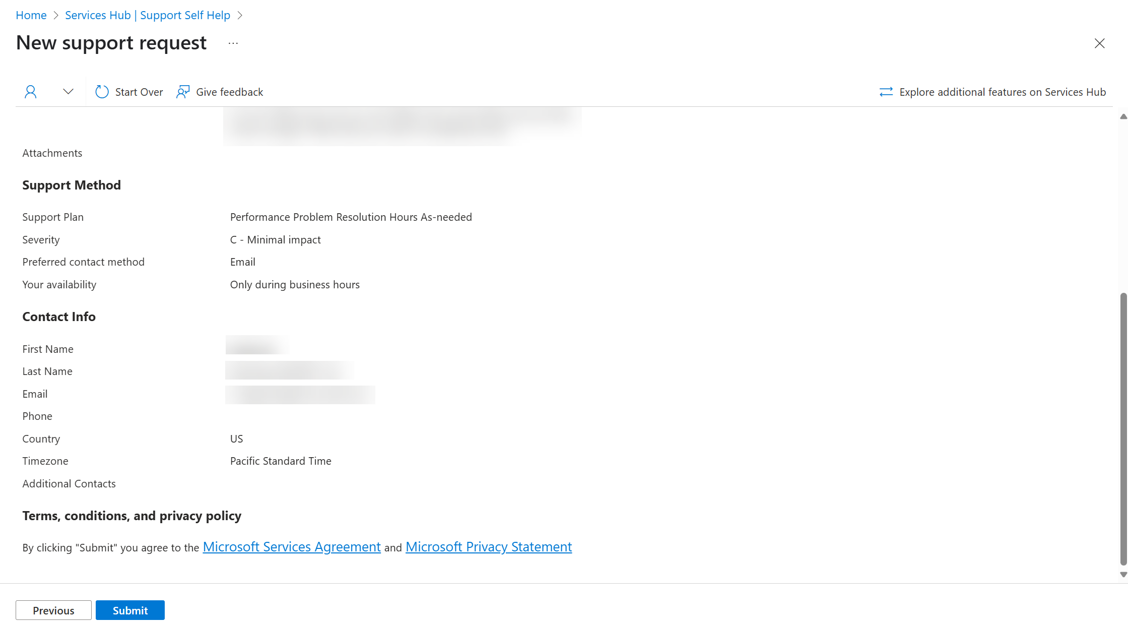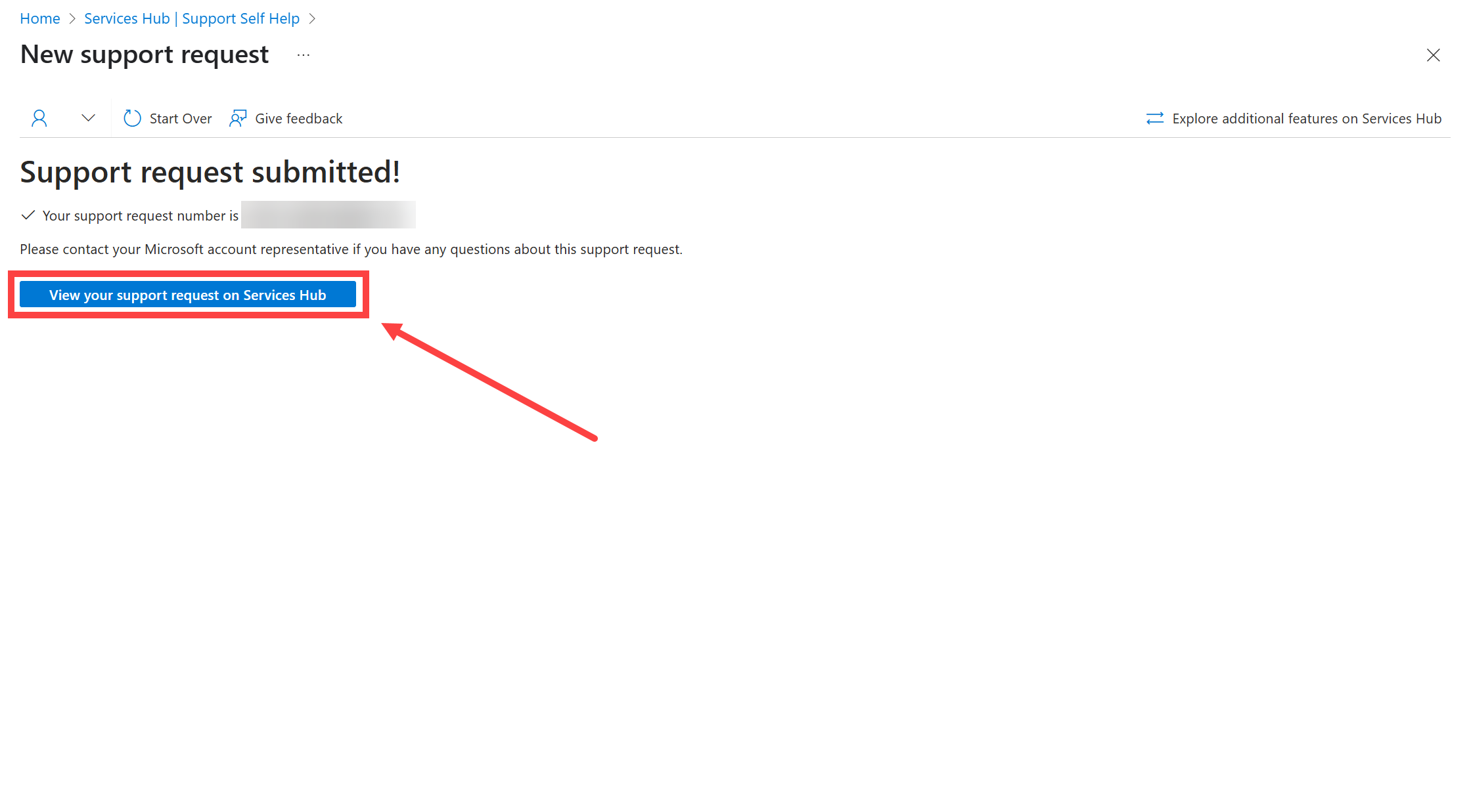 Na tela de confirmação, selecione "Exibir sua solicitação de suporte no Services Hub".