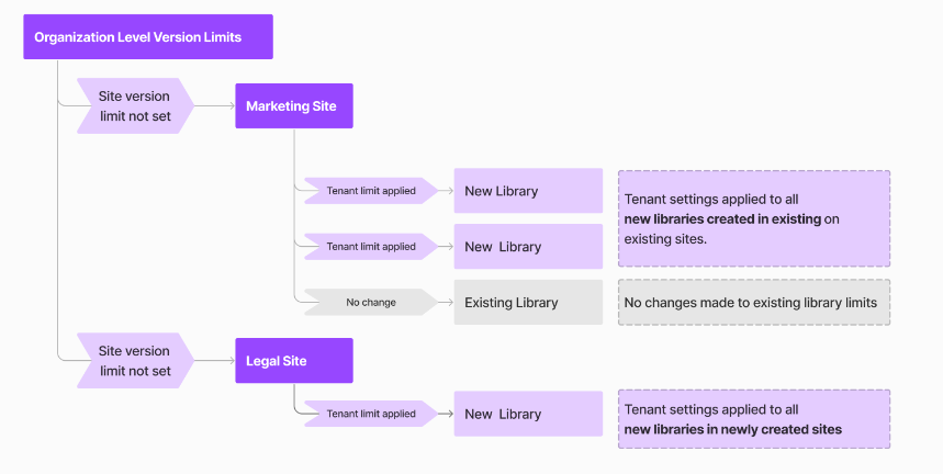Limites de versão da biblioteca no novo site legal: quando é criado um novo site legal, os limites de versão em todas as bibliotecas criadas no site legal são definidos para os limites de versão da organização.