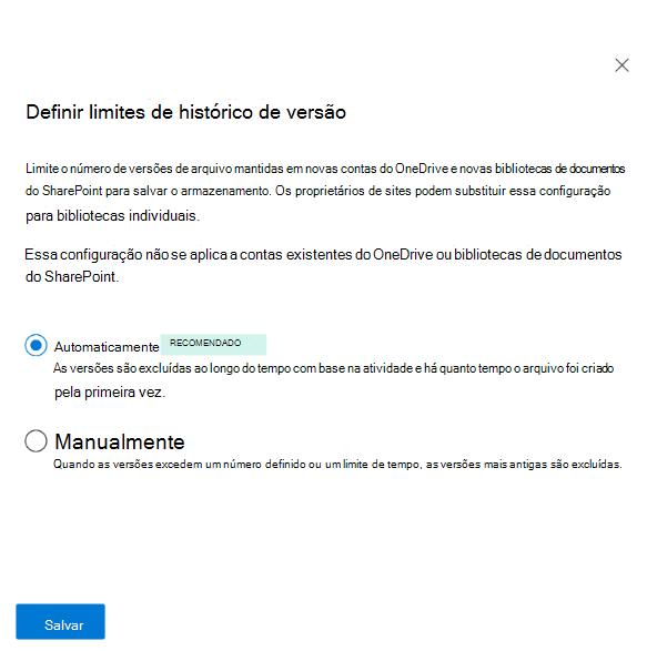 Este artigo descreve como os administradores globais e do SharePoint no Microsoft 365 podem alterar os limites predefinidos do histórico de versões para todas as novas bibliotecas de documentos do SharePoint e contas do OneDrive criadas na organização.