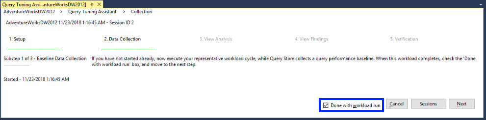 1. A Coleta de dados de linha de base solicita que o usuário execute o ciclo de carga de trabalho representativo para que o Repositório de Consultas possa coletar uma linha de base. Depois que essa carga de trabalho for concluída, marque a opção Concluir execução da carga de trabalho e selecione Avançar.