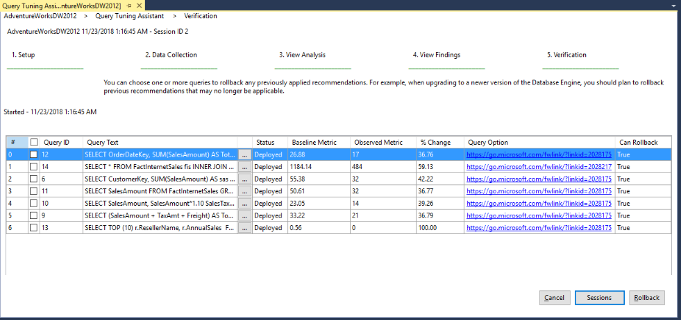 6. Verificação mostra o status de implantação das consultas já selecionadas para essa sessão. A lista nesta página diferencia-se da página anterior pela alteração da coluna Pode implantar para Pode reverter. Essa coluna pode ser True ou False dependendo se a otimização de consulta implantada pode ser revertida e seu guia de plano e removido.