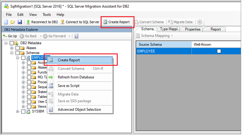 Clique com o botão direito do mouse sobre o esquema Db2 que você deseja migrar e selecione Criar relatório para gerar um relatório HTML. Você também pode selecionar Criar relatório no canto superior direito.