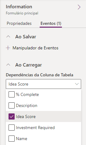Para que os dados de uma coluna de tabela estejam disponíveis para inclusão na lógica de um script, certifique-se de ter configurado o formulário para exibir a coluna. Observe que, se alguém remover a coluna do formulário posteriormente, isso fará com que seu script seja interrompido porque a coluna referenciada não estará mais disponível. Você pode adicionar a coluna como uma dependência para garantir que os dados da coluna estejam sempre disponíveis para sua lógica de script. A imagem a seguir mostra a adição da coluna Idea Score da tabela Idea como uma dependência.