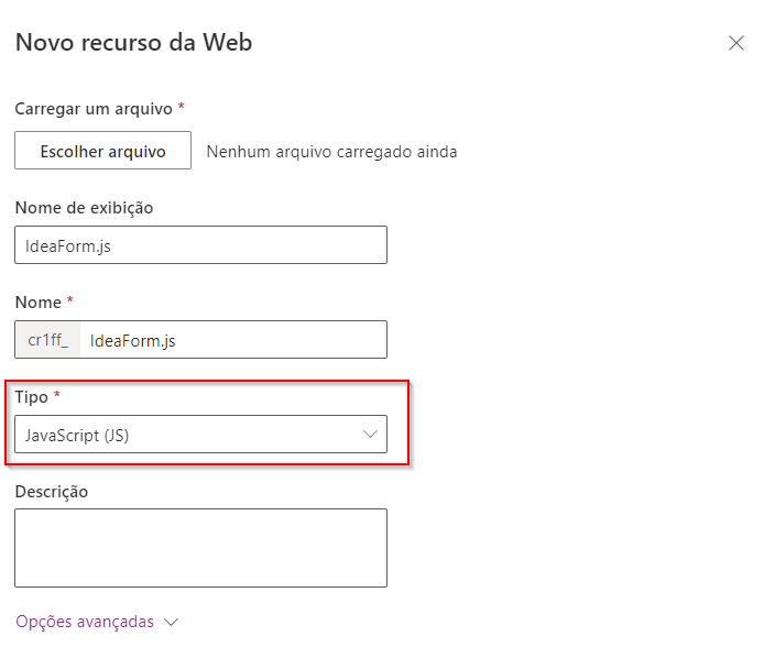 Para usar scripts de cliente em um formulário, um script deve primeiro ser carregado como um recurso da Web de script. Você pode usar recursos da Web de script para manter bibliotecas de funções de script de cliente escritas em JavaScript ou TypeScript e usá-las em um formulário de aplicativo baseado em modelo ou na definição da barra de comandos. Se for usar TypeScript, você deverá transpilá-lo em JavaScript antes de carregá-lo como um recurso da Web.