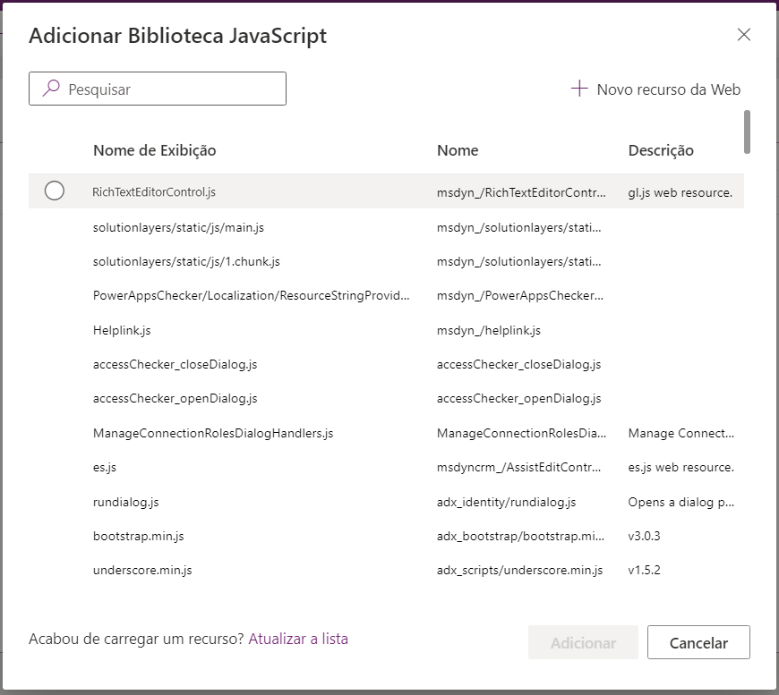 Na caixa de diálogo Adicionar biblioteca, você pode associar um recurso da Web de script carregado existente ou criar um novo.