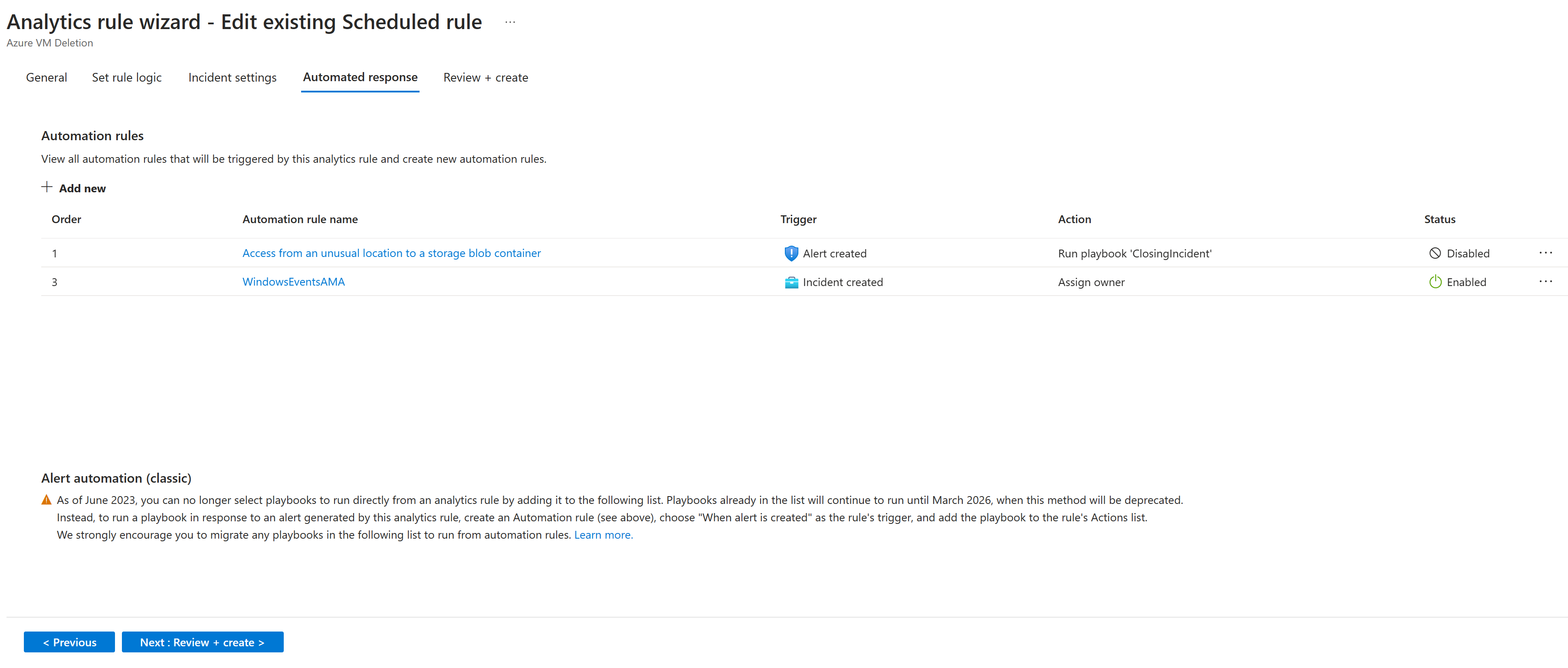 A exclusão da regra exibe uma solicitação de confirmação para que a Análise do Microsoft Sentinel a remova do conjunto de regras ativas. Por exemplo, você pode excluir uma regra sobre um serviço ou um recurso que não está em uso, o que elimina a necessidade da regra. A exclusão de uma regra é permanente, e não há um recurso para desfazer a ação. Portanto, recomendamos que você primeiro desabilite a regra por um período até ter certeza de que não precisa dela.