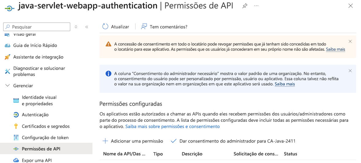 Captura de tela que mostra o painel de permissões de API de um aplicativo registrado com o Microsoft Entra ID no portal do Azure.