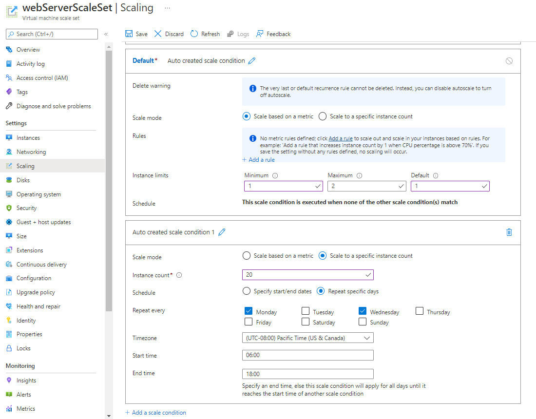 O dimensionamento baseado em agendamento especifica uma hora de início e de término, bem como o número de instâncias a serem adicionadas ao conjunto de dimensionamento. A captura de tela a seguir mostra um exemplo no portal do Azure. O número de instâncias é expandido para 20 entre 6h e 18h, toda segunda-feira e quarta-feira. Fora desses horários, se não houver outras condições de escala, a condição de escala padrão será aplicada.
