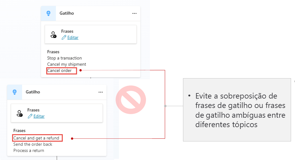 Evitar frases de gatilho muito ambíguas entre diferentes tópicos: como um agente típico pode ter vários tópicos associados a ele, verifique se seus gatilhos são os mais exclusivos possíveis para cada tópico. Se uma frase de gatilho puder ser aplicada a vários tópicos, o agente poderá não entender qual tópico usar.