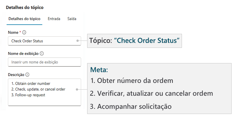 Ao criar tópicos, você precisará definir o Nome, o Nome de exibição e a Descrição do tópico. O nome e o nome de exibição ajudam você a identificar o tópico com mais facilidade enquanto cria seu agente.