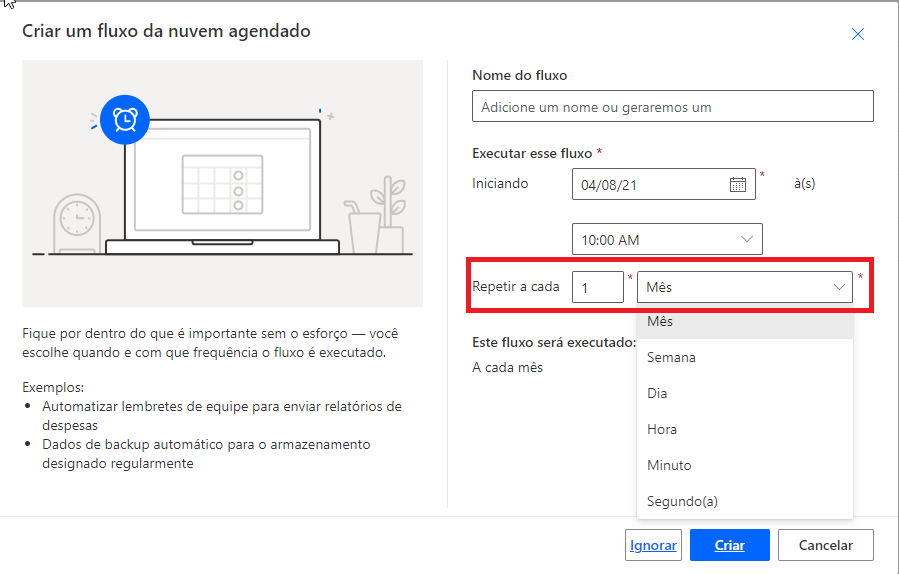 Para a seção Repetir a cada, defina o tempo que deve decorrer para o fluxo ser executado novamente definindo o número de segundos, minutos, horas, dias, semanas ou meses entre cada execução do fluxo.