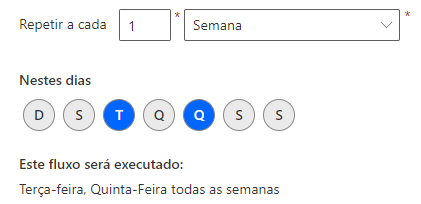 Selecionar Semana exibirá mais opções para definir os dias da semana em que o fluxo deverá ser executado. Por exemplo, você pode executar o fluxo às terças e quintas semanalmente.