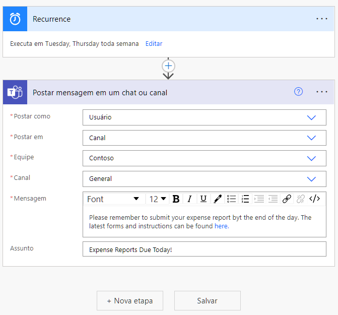 Depois que um fluxo agendado for disparado, ele processará as tarefas definidas nele, assim como qualquer outro fluxo. O exemplo a seguir mostra um fluxo simples para enviar um lembrete para entregar relatórios de despesas como uma mensagem do Teams toda sexta-feira. Use os controles de edição de texto na janela da mensagem para criar hiperlinks para que os usuários encontrem recursos importantes com facilidade.