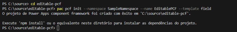 pac pcf init --namespace SampleNamespace --name EditablePCF --template fieldA imagem a seguir mostra um exemplo da saída que deve ser exibida.
