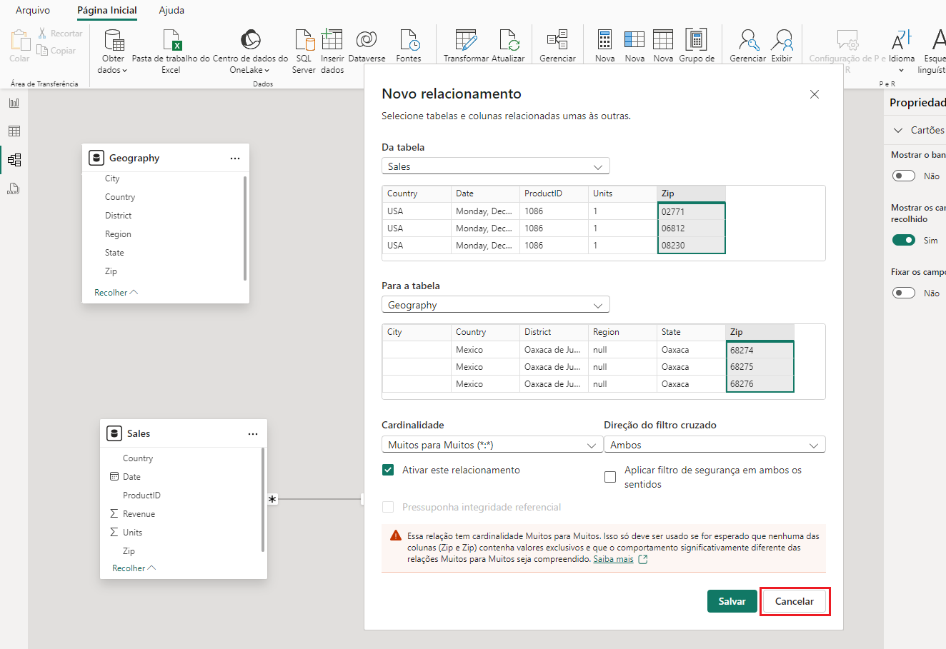 Você vê esse aviso porque não há valores Zip exclusivos na tabela Geography. Vários países podem ter o mesmo CEP, que aciona o aviso. Vamos concatenar as colunas Zip e Country para criar um campo de valor exclusivo para corrigir o problema.