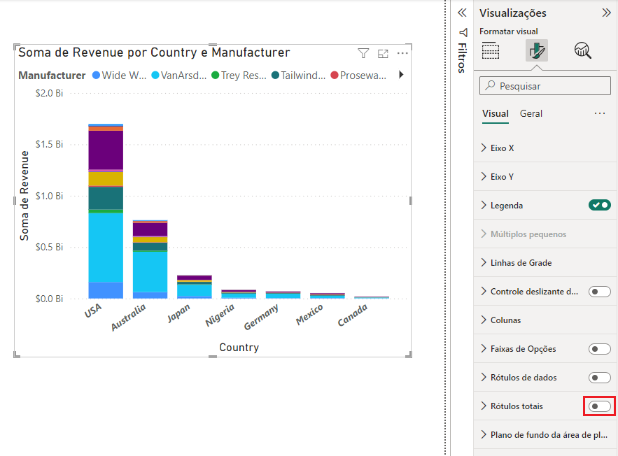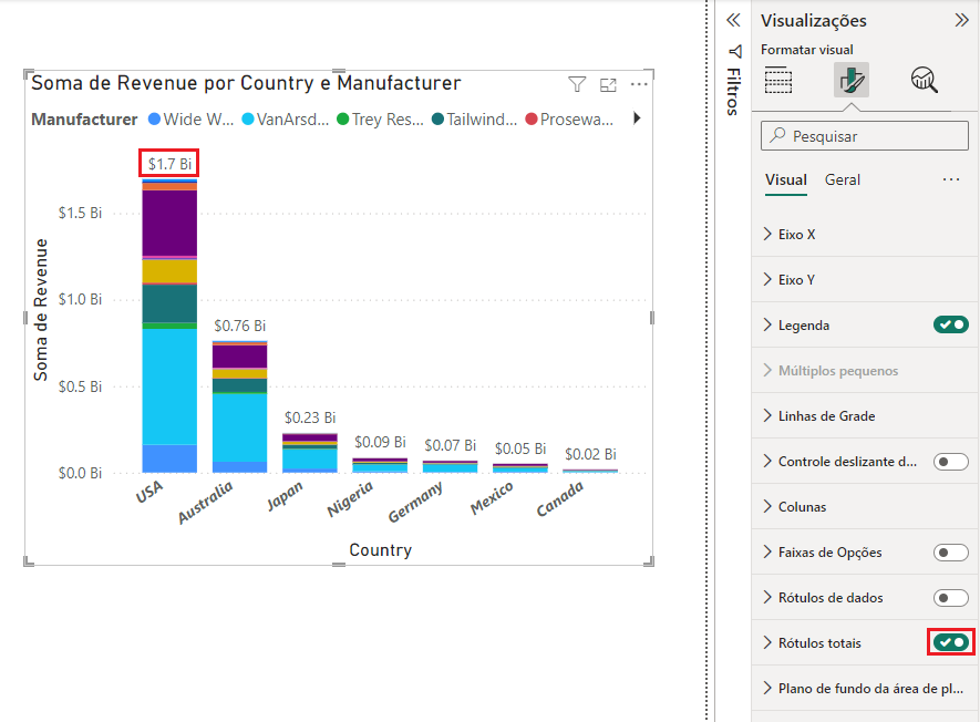 Se quiser, agora você pode recolher o painel Filtros até que seja necessário novamente. Agora, adicione rótulos totais aos visuais empilhados. Você começa com opções de formatação de fonte.