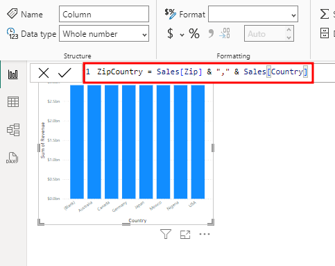 Agora, você pode combinar as colunas Zip e Country em uma nova coluna chamada ZipCountry. Para criar essa coluna chamada ZipCountry, digite o cálculo a seguir na barra de fórmulas: