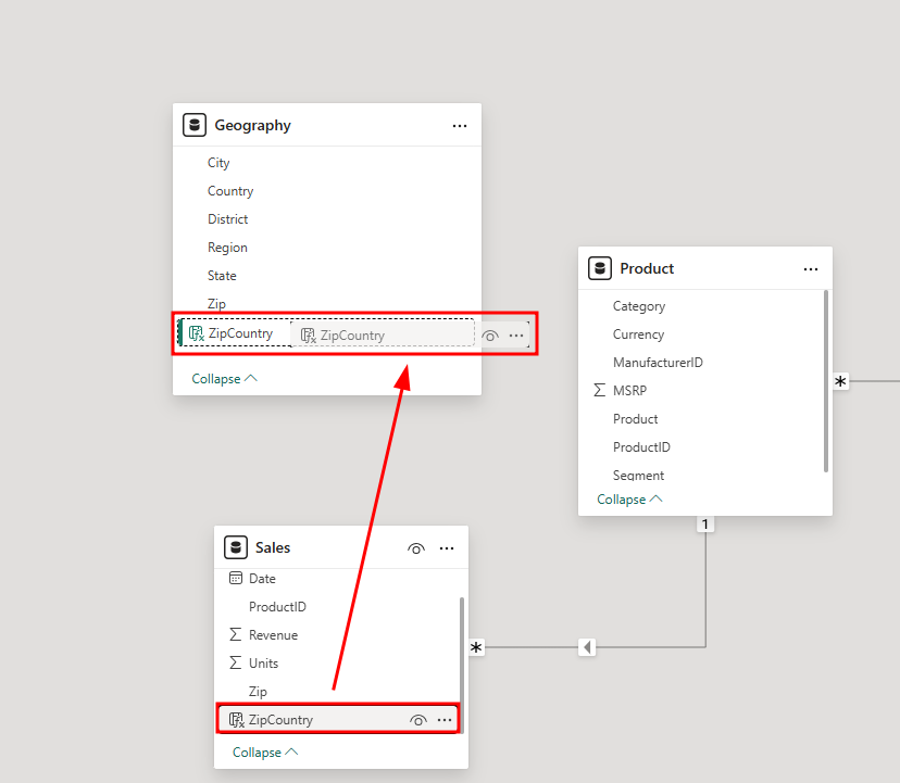 Se a coluna ZipCountry não for exibida, selecione Recolher duas vezes na parte inferior das tabelas Geography e Sales. Talvez seja necessário rolar para baixo na lista de colunas em cada tabela.