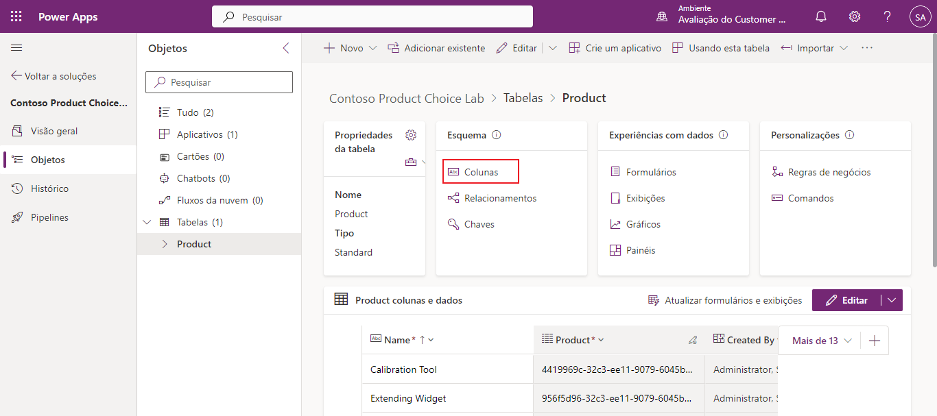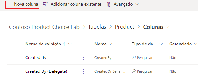 Neste exercício, você ajudará a Contoso a adicionar colunas de opção a uma tabela existente do Dataverse. Em seguida, você modificará o aplicativo Gerenciamento de Produtos para usar as novas colunas.
