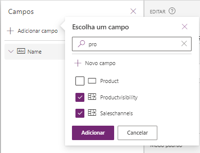 Selecione as colunas Visibilidade do produto e Canal de vendas e, depois, Adicionar.