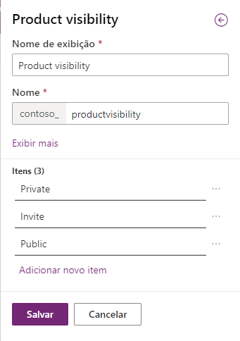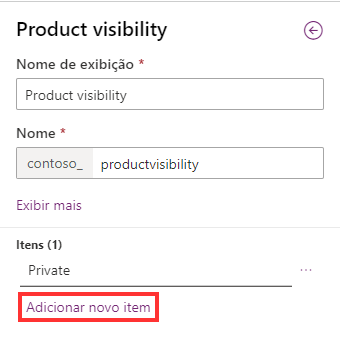No painel Nova coluna à direita da tela, insira Product visibility para o Nome de exibição, selecione Opção em Tipo de dados e selecione Opção novamente na lista suspensa.