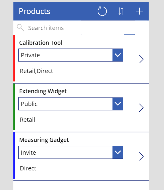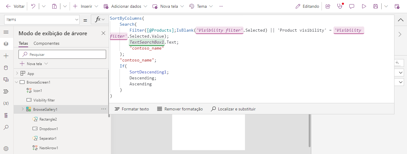 SortByColumns( Search( Filter([@Products],IsBlank('Visibility filter'.Selected) || 'Product visibility' = 'Visibility filter'.Selected.Value), TextSearchBox1.Text, Name ), "contoso_name", If( SortDescending1, SortOrder.Descending, SortOrder.Ascending ) )Selecione Visualizar o aplicativo (ou pressione F5).