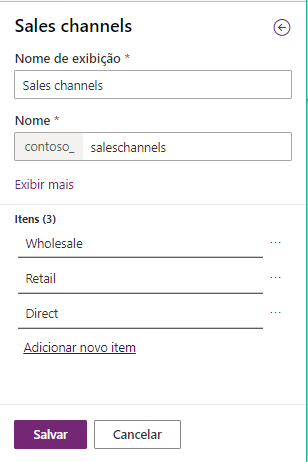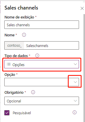 Insira Canais de vendas para o Nome de exibição, selecione Opção para Tipo de dados e selecione Opção no menu suspenso.