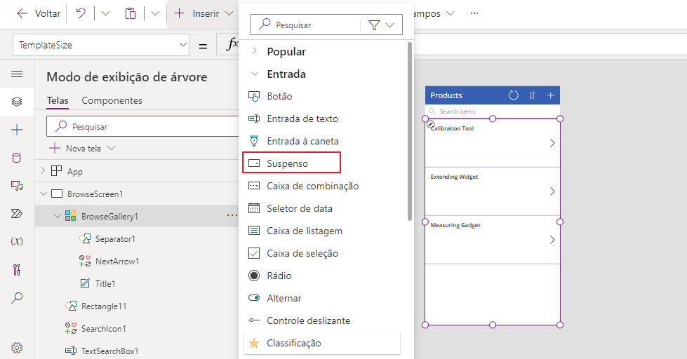 Parent.Width/2Selecione BrowseScreen1 no menu Modo de exibição de árvore à esquerda. Em seguida, na faixa de opções na parte superior, selecione Inserir, expanda Entrada e selecione Suspenso.