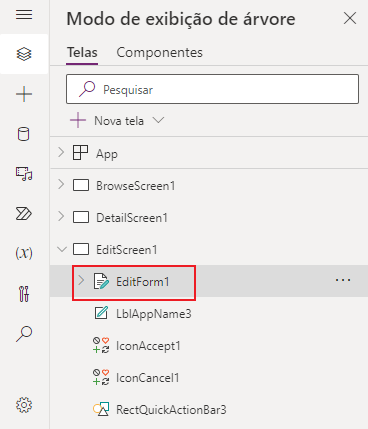 Na guia Exibição de árvore, expanda EditScreen1 e selecione EditForm1.