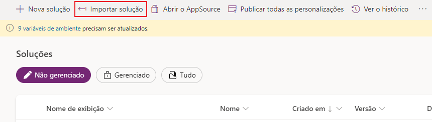Selecione Importar e aguarde a conclusão do processo de importação da solução.