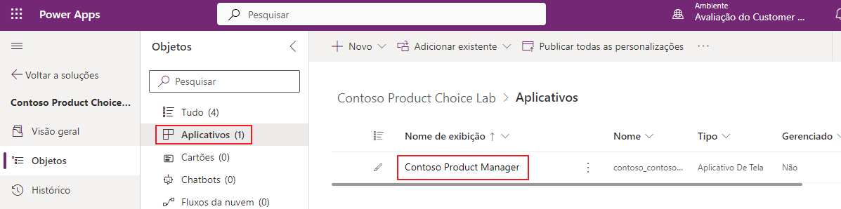 Se você navegou para outro local, encontre suas soluções e selecione para abrir a solução Contoso Product Choice Lab. Se você ainda estiver na solução, no painel de navegação Objetos, localize/selecione Aplicativos