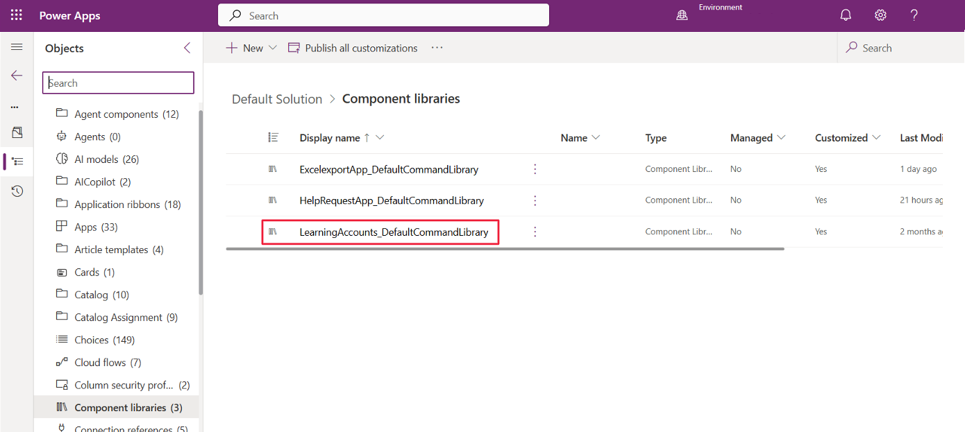 É melhor criar uma solução personalizada do Dataverse para seu aplicativo e ativos relacionados. Se o aplicativo estiver em uma solução personalizada, a biblioteca de componentes também estará. Caso contrário, eles serão colocados na Solução Padrão Common Data Services. O nome da biblioteca de componentes combina o nome do seu aplicativo com DefaultCommandLibrary. A imagem seguinte mostra uma solução que inclui aplicativos, fluxos e bibliotecas de componentes:
